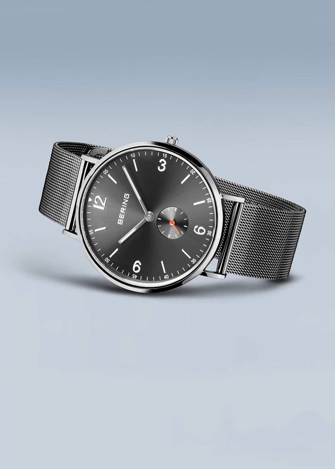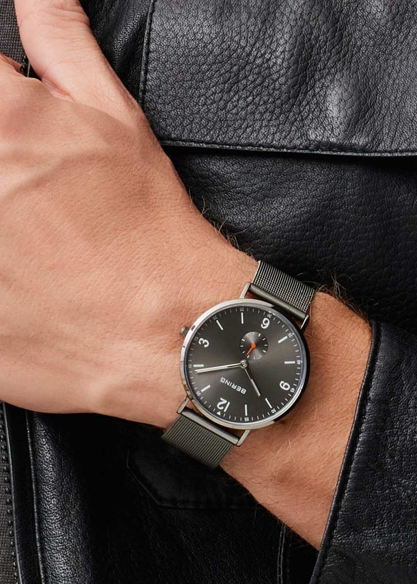 Секундная стрелка вынесена на отдельный циферблат. Рифленая заводная головка. Стальной браслет миланского плетения. Застежка с фиксатором.