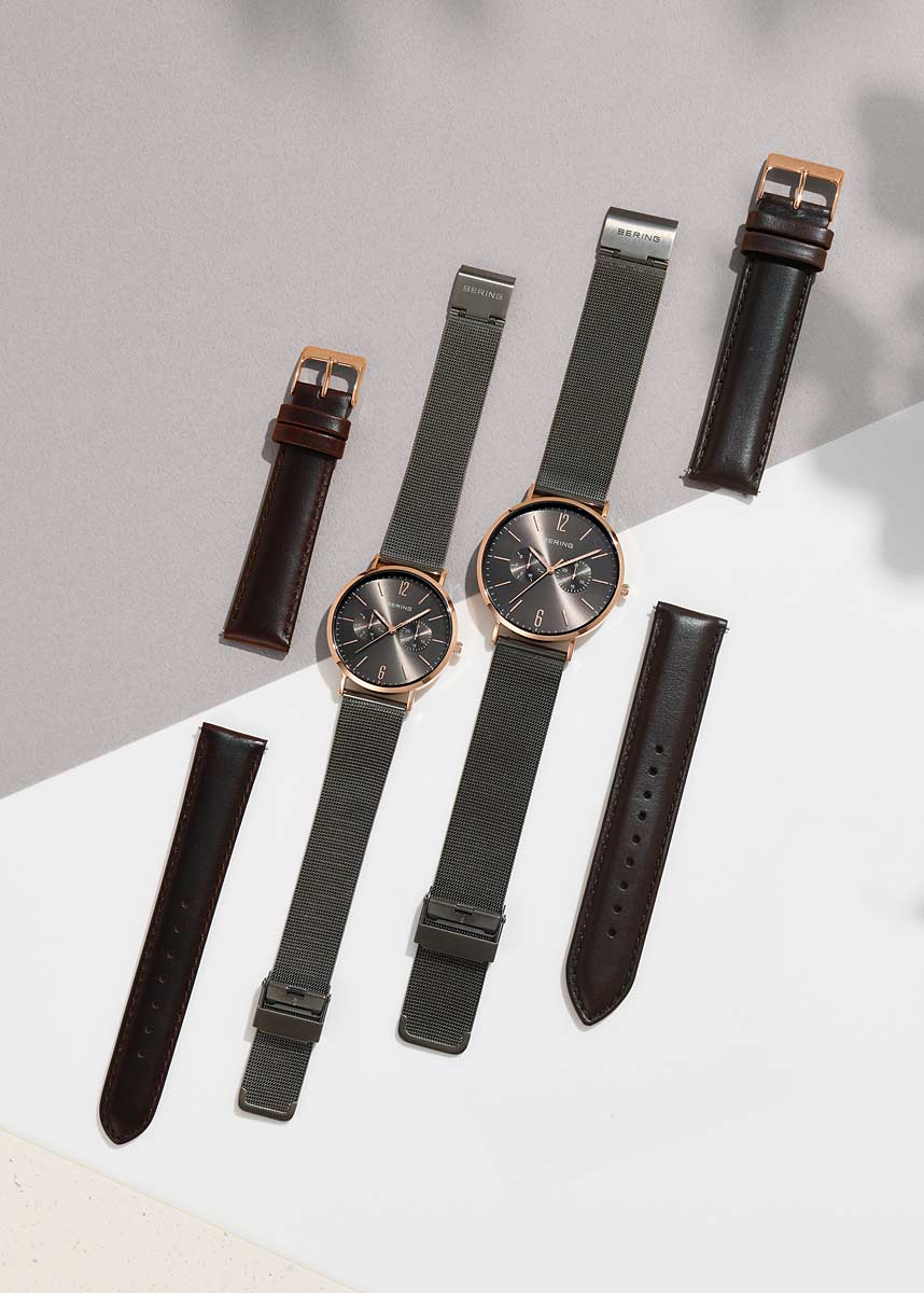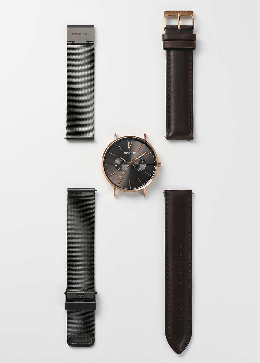 Дата и день недели вынесены на отдельные циферблаты. Рифленая заводная головка. Стальной браслет миланского плетения. Застежка с фиксатором. В комплекте коричневый кожаный ремешок.