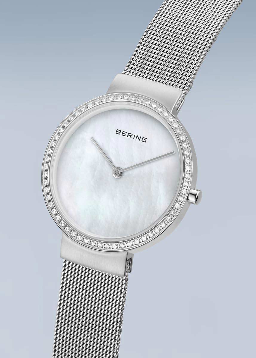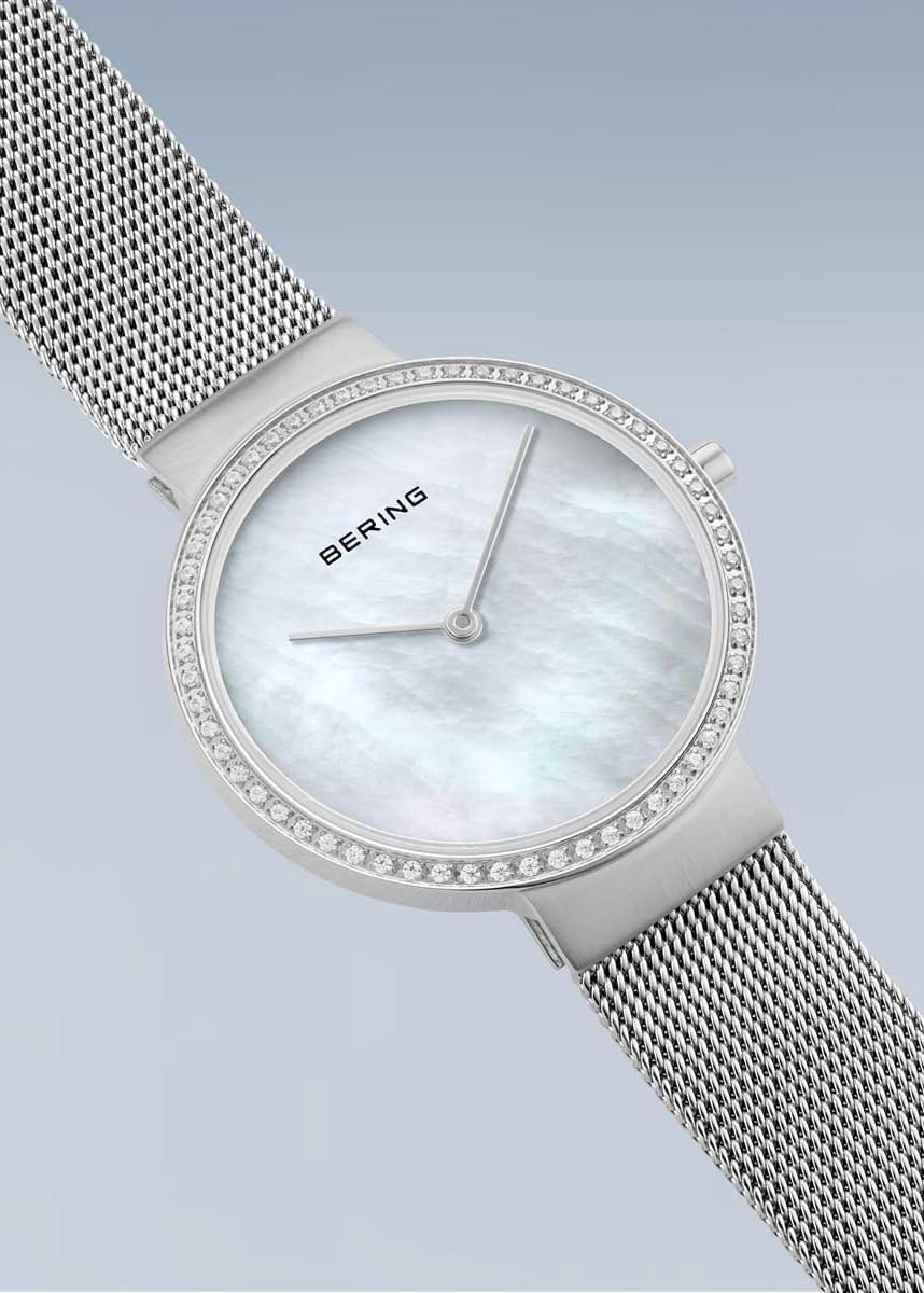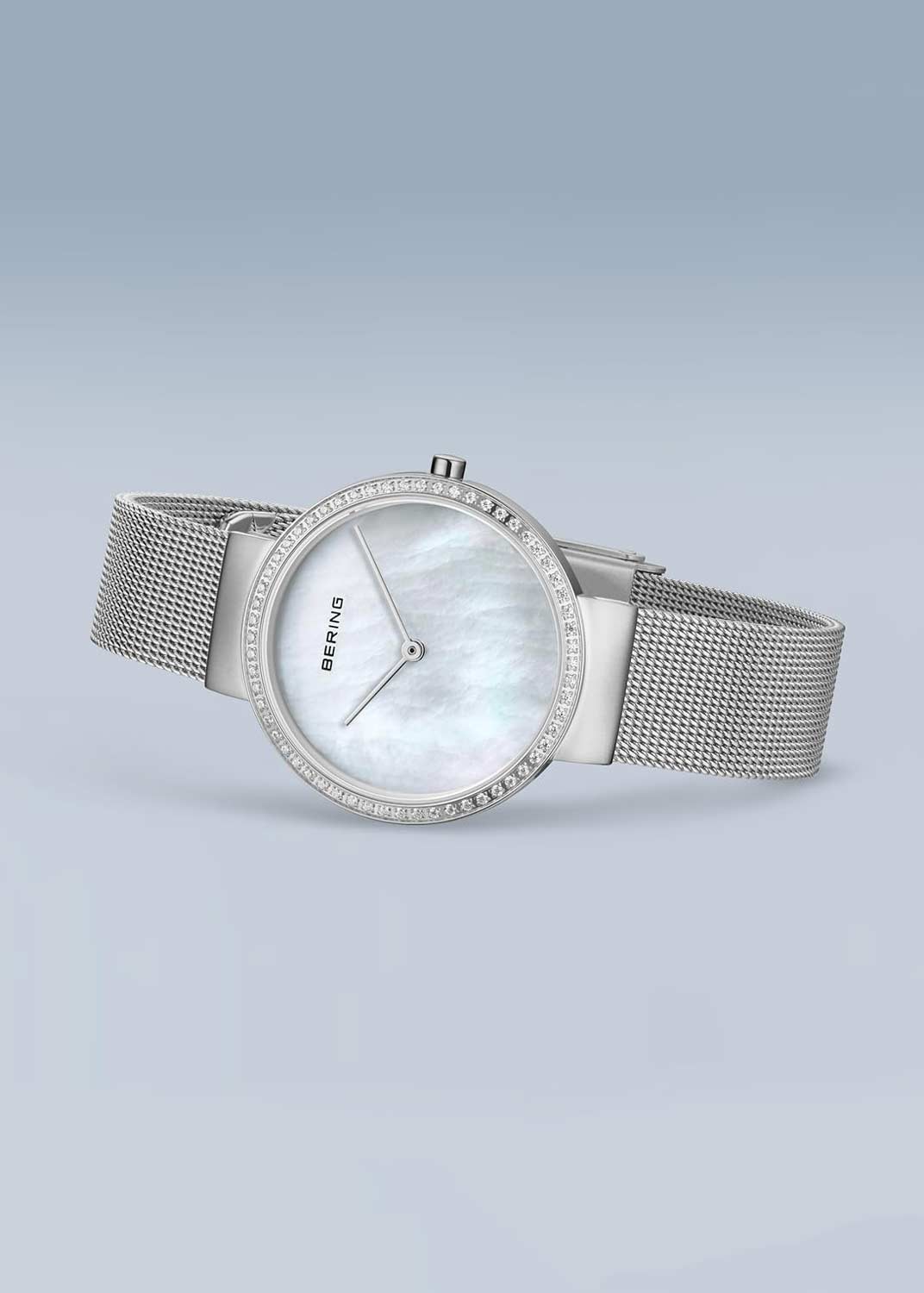 Ультратонкие женские наручные часы. Круглый стальной корпус с полированной и сатинированной поверхностью. Безель инкрустирован кристаллами. Перламутровый циферблат без меток защищен прочным сапфировым стеклом. Гладкая заводная головка. Задняя крышка крепится на винтах. Стальной браслет миланского плетения. Застежка с фиксатором.