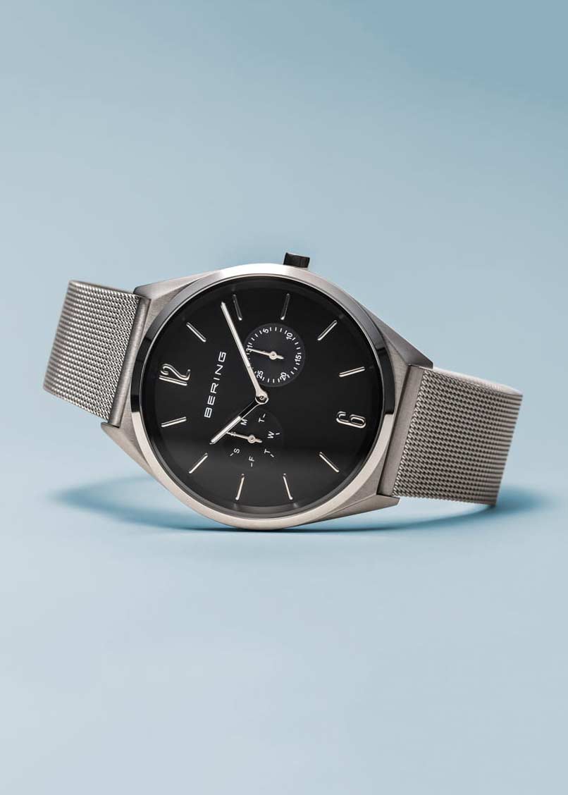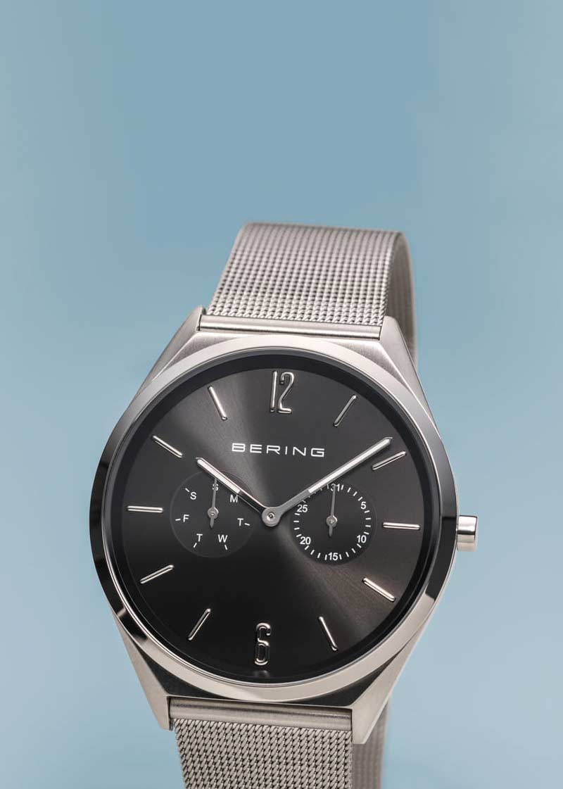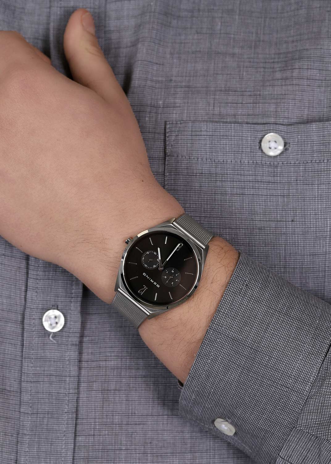 Дата и день недели вынесены на отдельные циферблаты. Гладкая заводная головка. Стальной браслет миланского плетения. Застежка с фиксатором.