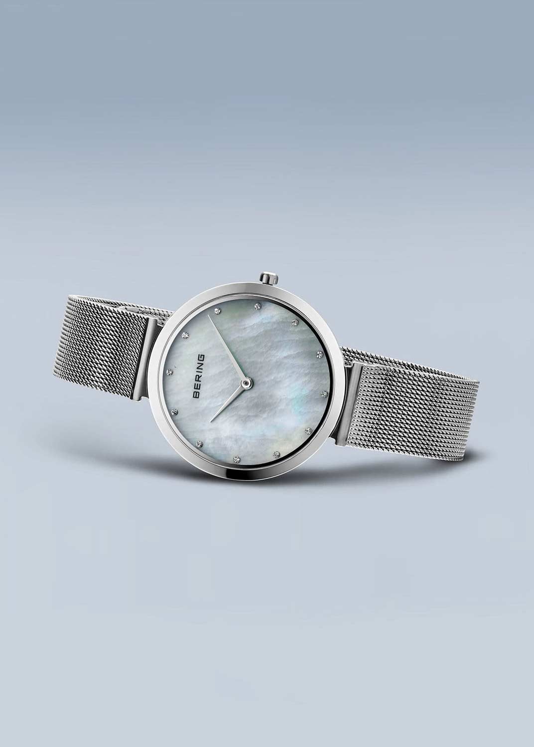 Женские наручные часы. Круглый стальной корпус с полированной поверхностью. Перламутровый циферблат защищен прочным сапфировым стеклом. Метки в виде точек с кристаллами Swarovski. Гладкая заводная головка. Стальной браслет миланского плетения. Застежка с фиксатором.