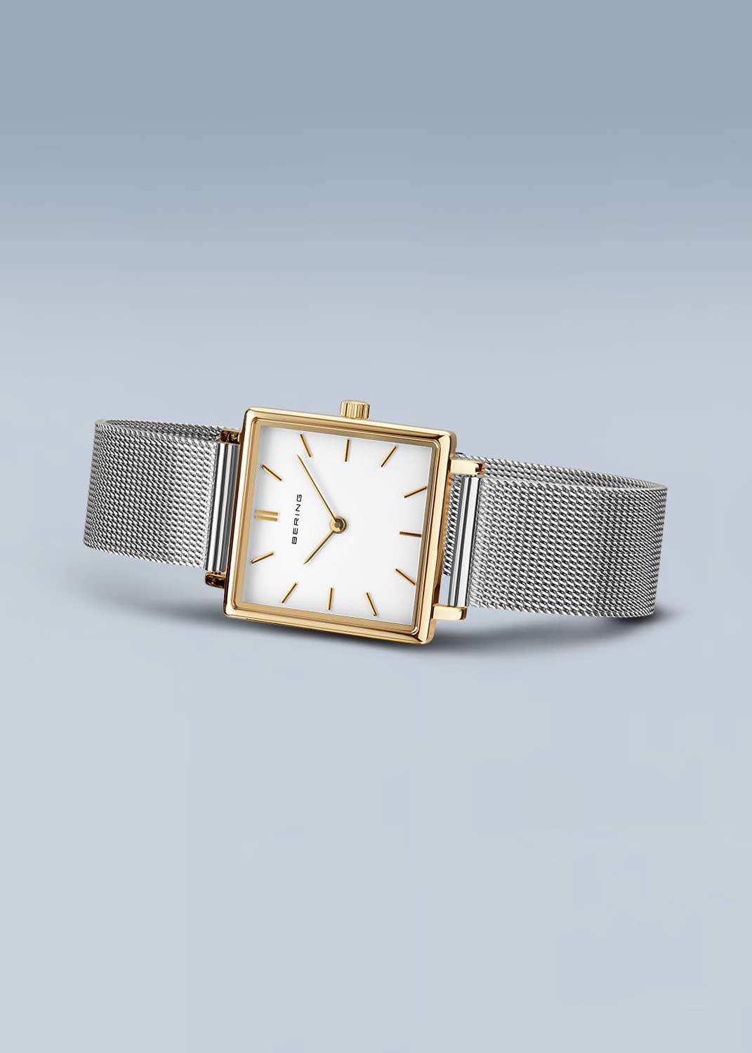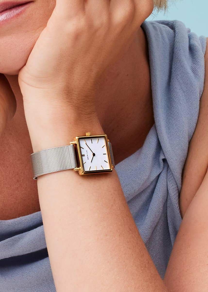 Ультратонкие женские наручные часы. Квадратный стальной корпус с полированной поверхностью. Циферблат защищен прочным сапфировым стеклом. Метки в виде штрихов. Рифленая заводная головка. Стальной браслет миланского плетения. Застежка с фиксатором.
