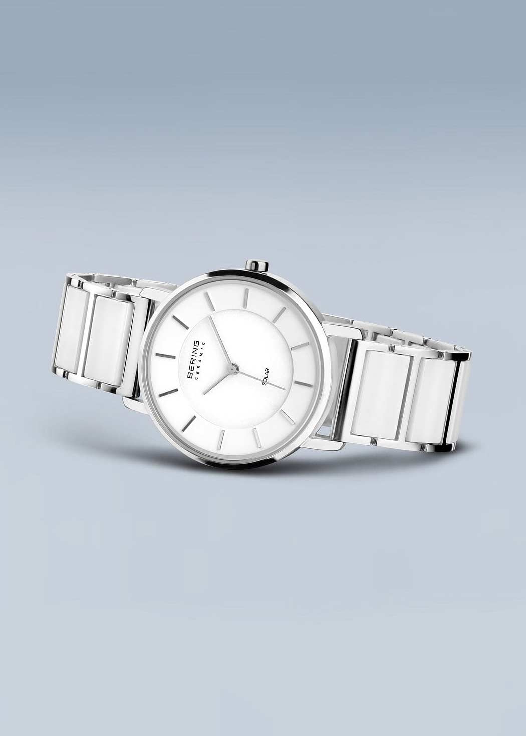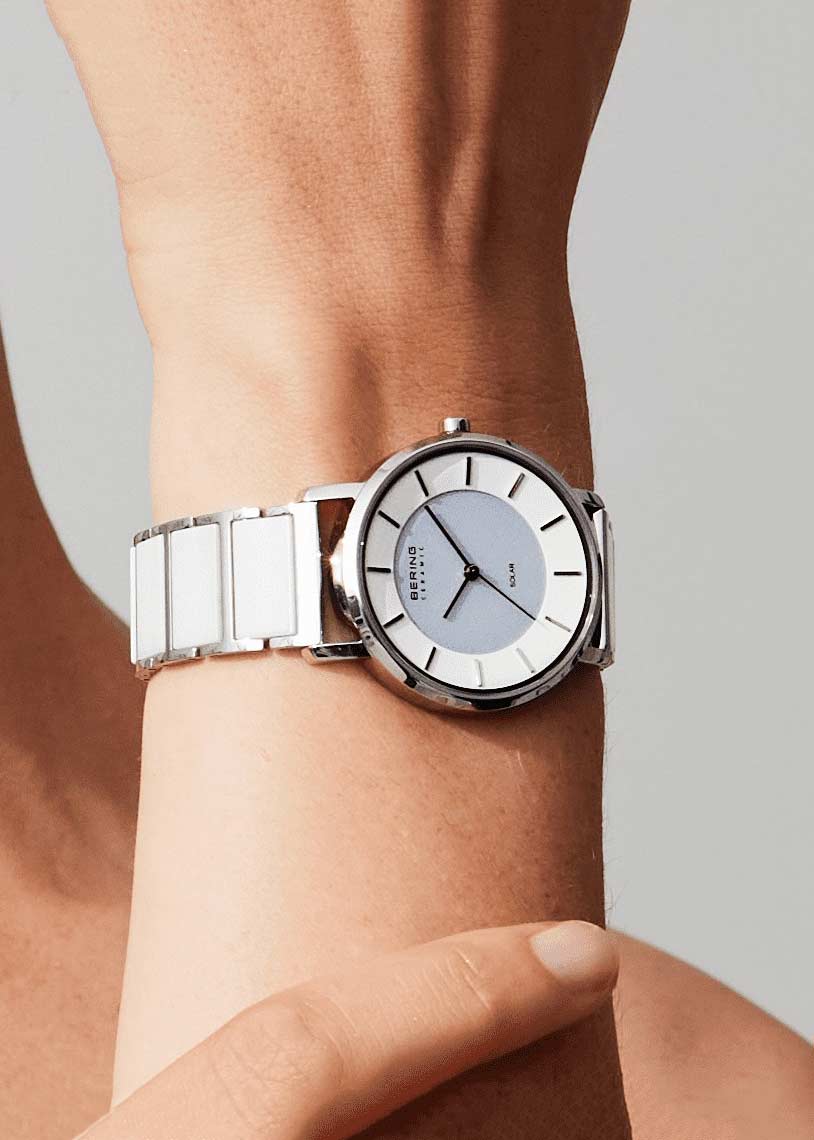 Женские наручные часы. Питание от солнечной энергии. Круглый стальной корпус с полированной поверхностью. Циферблат защищен прочным сапфировым стеклом. Метки в виде штрихов. Гладкая заводная головка. Стальной браслет с керамическими звеньями. Раскладывающаяся застежка.