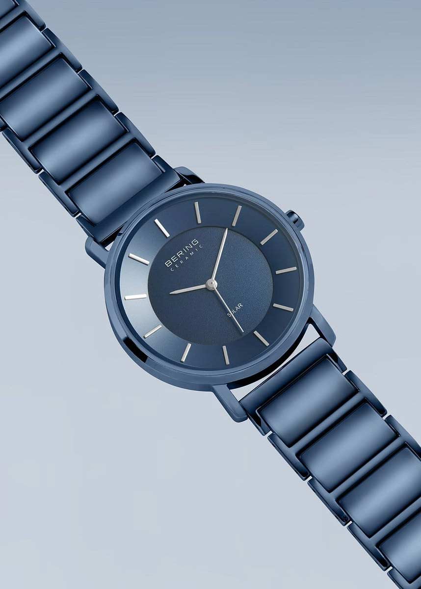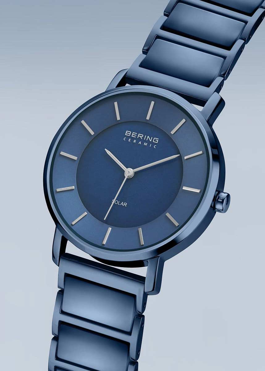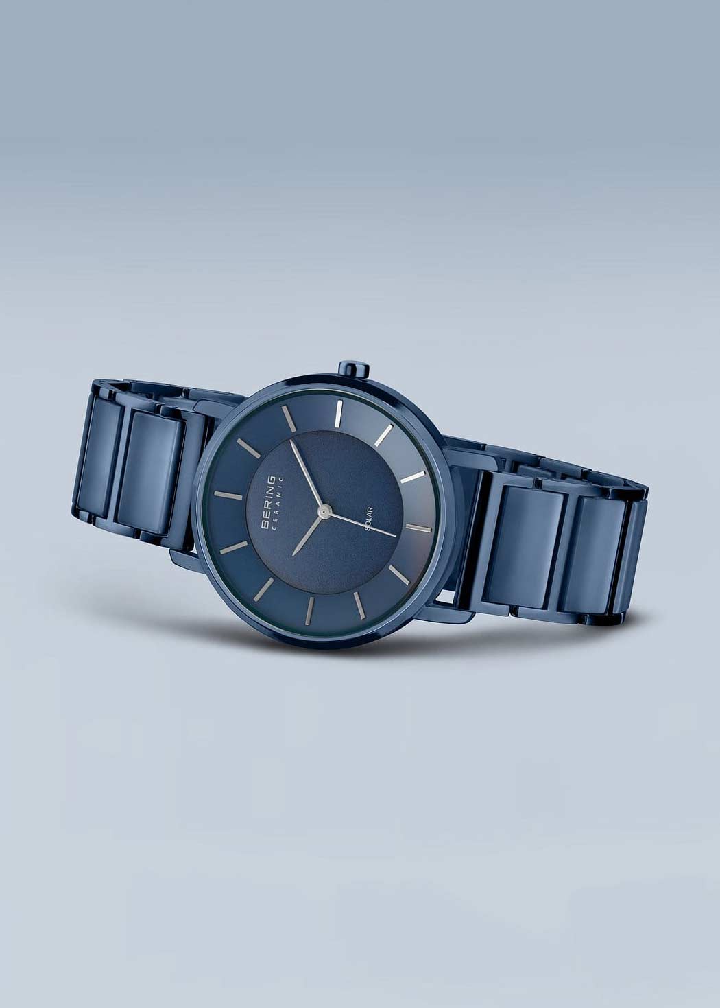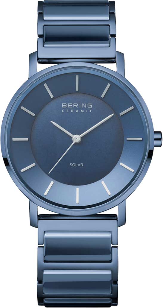 Женские наручные часы. Питание от солнечной энергии. Круглый стальной корпус с полированной поверхностью. Циферблат защищен прочным сапфировым стеклом. Метки в виде штрихов. Гладкая заводная головка. Стальной браслет с керамическими звеньями. Раскладывающаяся застежка.