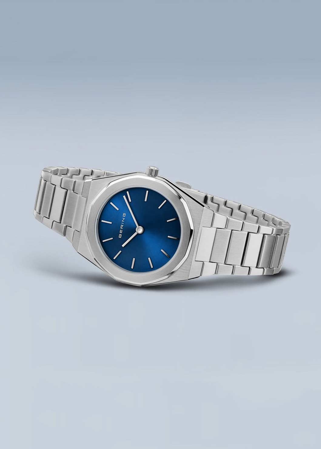 Ультратонкие женские наручные часы. Стальной корпус с полированной и сатинированной поверхностью. Граненый безель. Циферблат выполнен по технологии Sunray (солнечные лучи) и защищен прочным сапфировым стеклом. Метки в виде штрихов. Рифленая заводная головка. Стальной браслет с раскладывающейся застежкой.