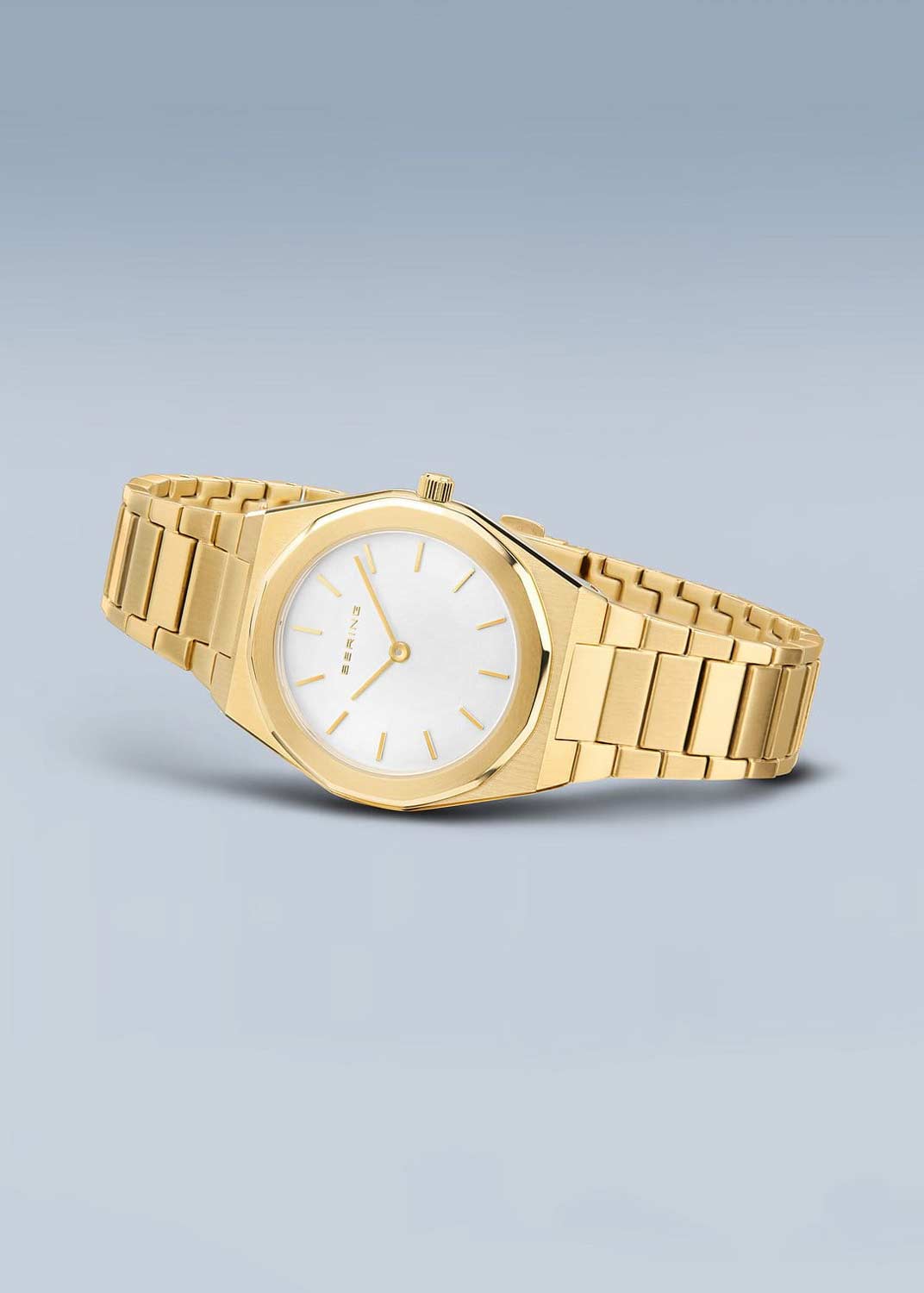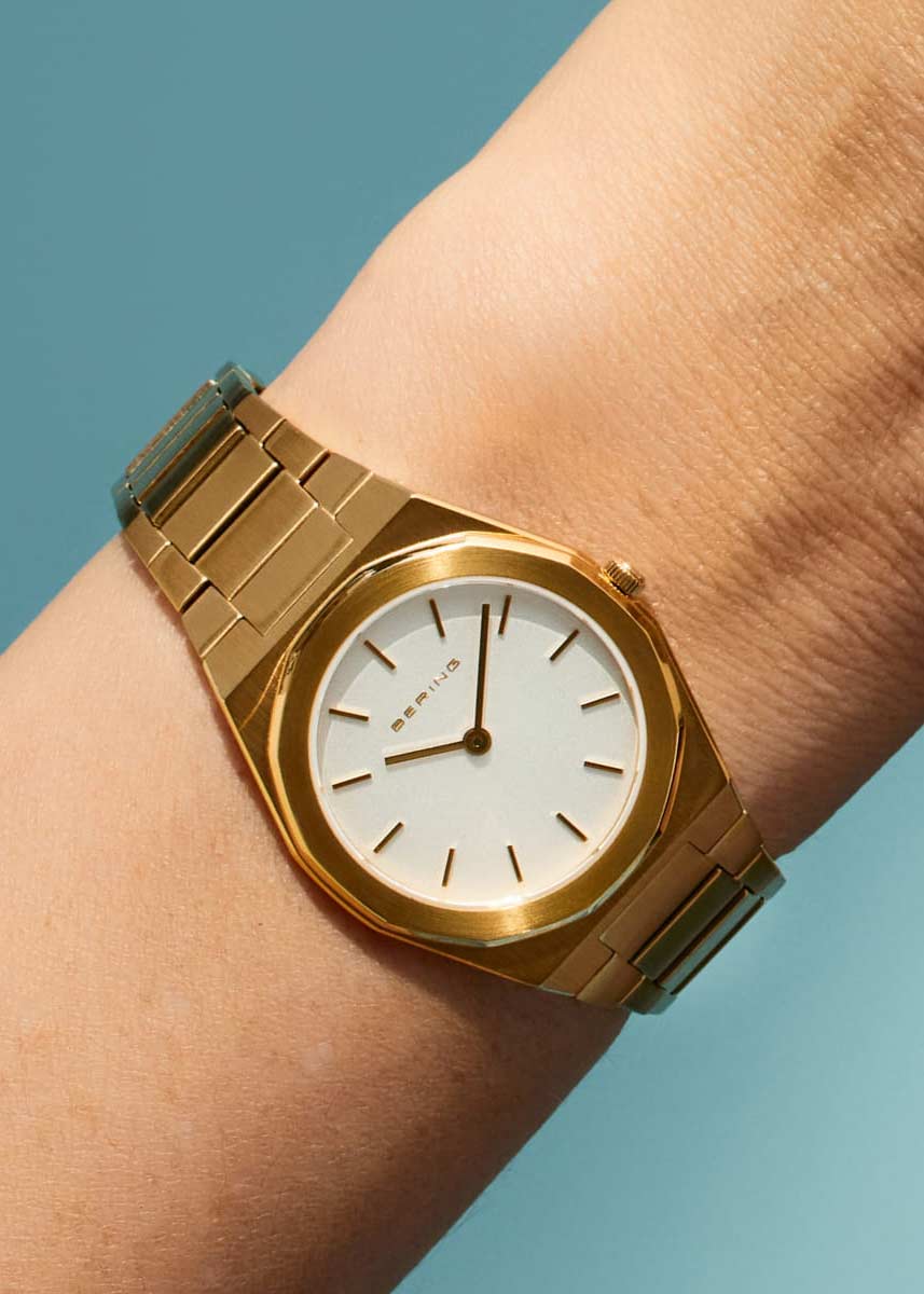 Ультратонкие женские наручные часы. Стальной корпус с полированной и сатинированной поверхностью. Граненый безель. Циферблат защищен прочным сапфировым стеклом. Метки в виде штрихов. Рифленая заводная головка. Стальной браслет с раскладывающейся застежкой.