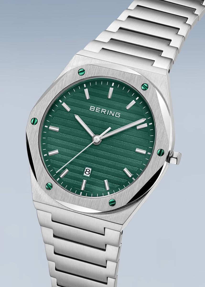 Мужские наручные часы. Стальной корпус с сатинированной поверхностью. Граненый безель с декоративными винтами. Циферблат с рисунком в полоску защищен прочным сапфировым стеклом. Метки в виде штрихов. Окошко даты находится в положении 6 часов. Шестигранная заводная головка. Завинчивающаяся задняя крышка. Стальной браслет с раскладывающейся застежкой.