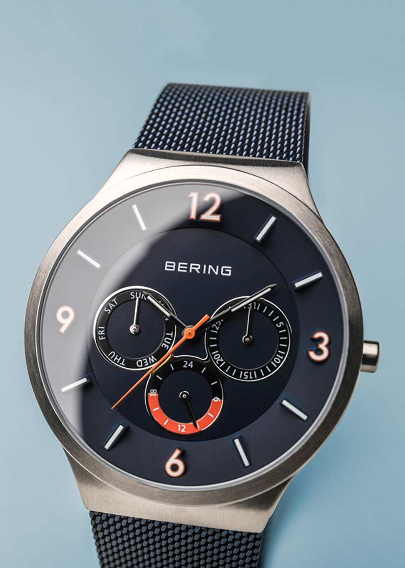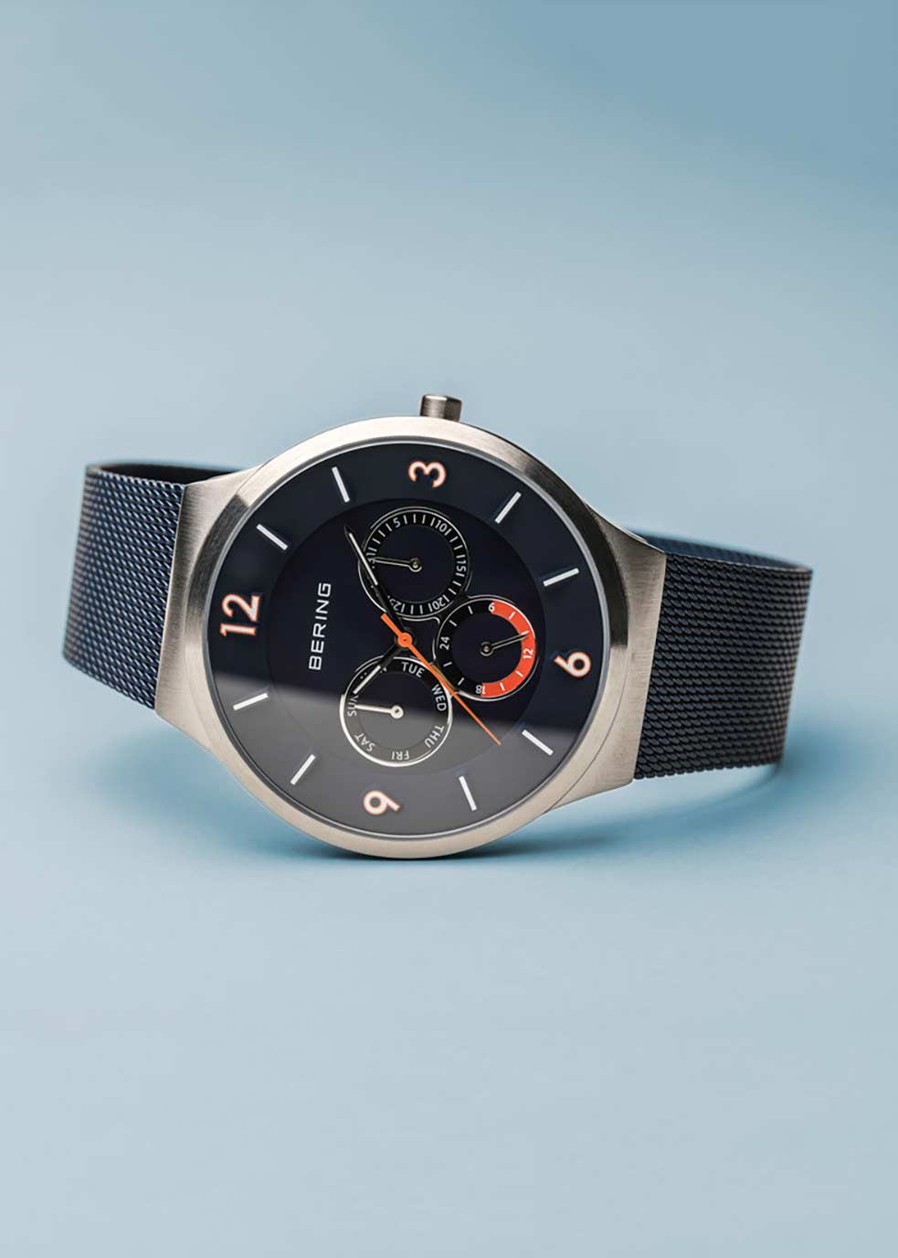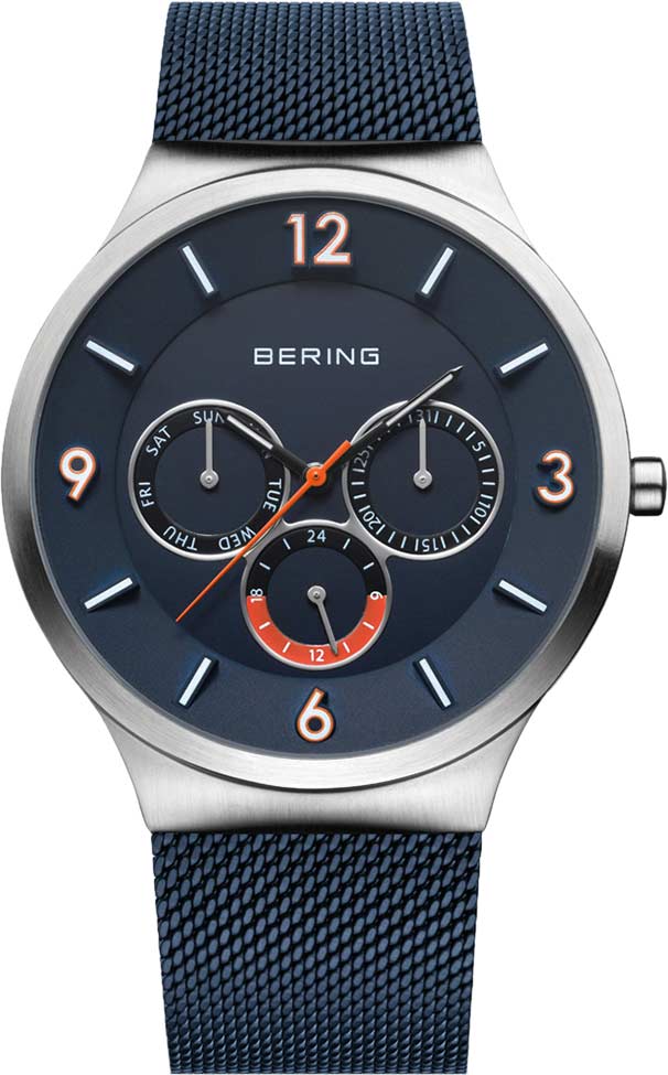 Мужские наручные часы. 12-ти и 24-х часовой формат времени. Круглый стальной корпус с сатинированной поверхностью. Циферблат защищен прочным сапфировым стеклом. Метки в штрихов и арабских цифр. Время в 24-х часовом формате, дата и день недели вынесены на отдельные циферблаты.
