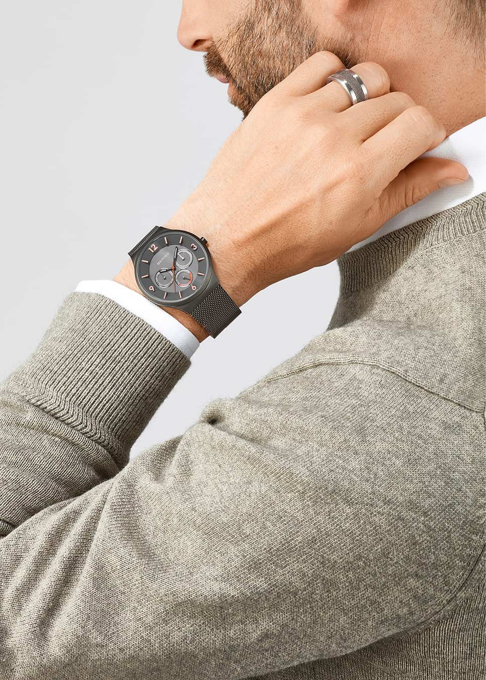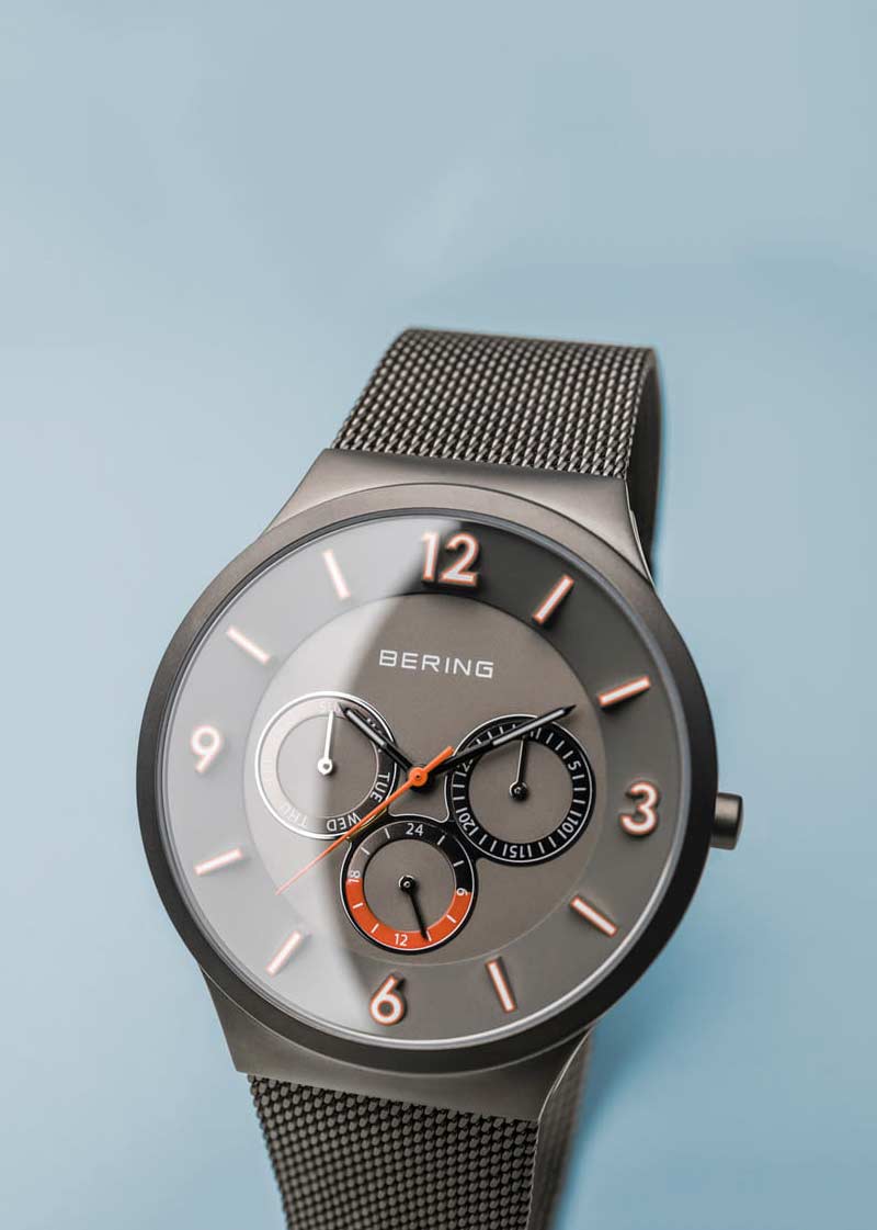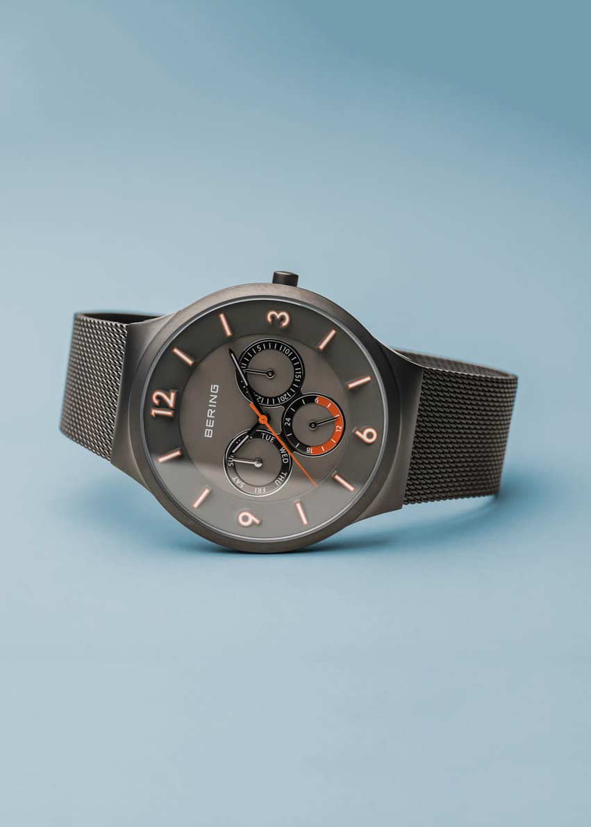 Мужские наручные часы. 12-ти и 24-х часовой формат времени. Круглый стальной корпус с сатинированной поверхностью. Циферблат защищен прочным сапфировым стеклом. Метки в штрихов и арабских цифр. Время в 24-х часовом формате, дата и день недели вынесены на отдельные циферблаты.