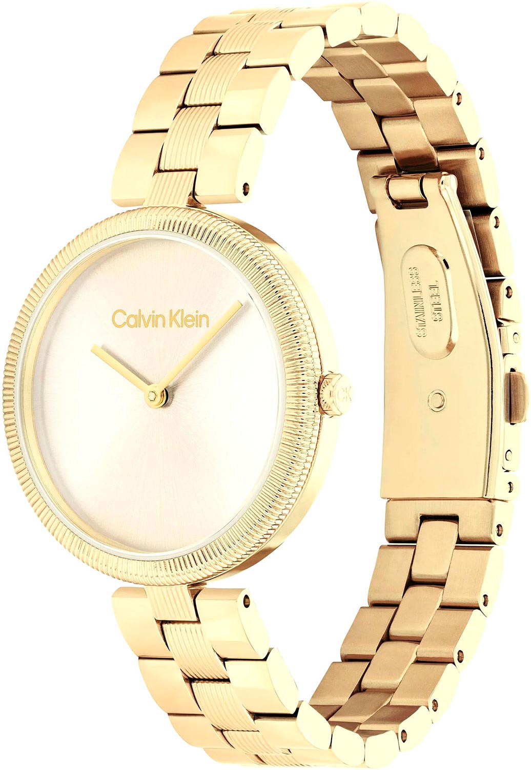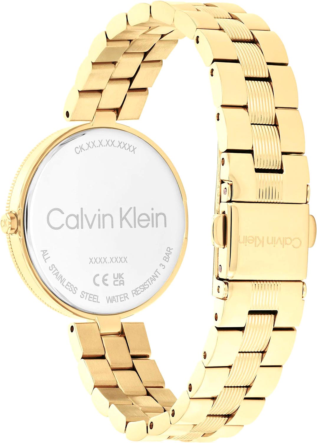 Циферблат выполнен по технологии Sunray (солнечные лучи), украшен фирменным логотипом Calvin Klein и защищен минеральным стеклом. Метки отсутствуют. Прямоугольные стрелки в стиле Baton. Секундная стрелка отсутствует.