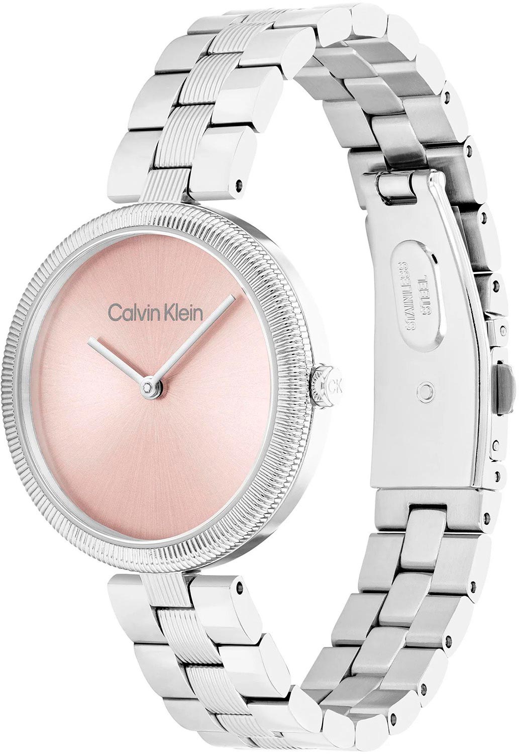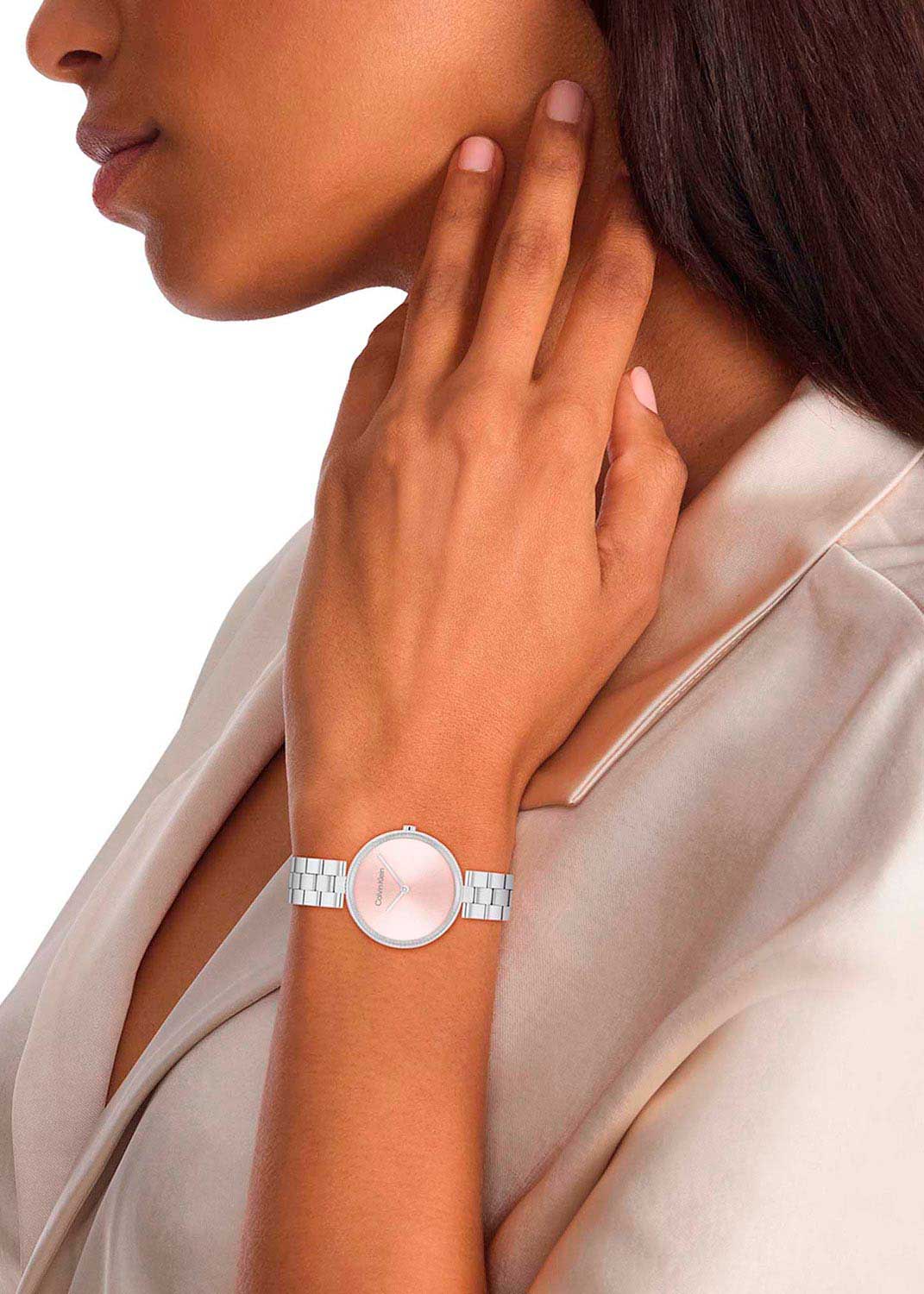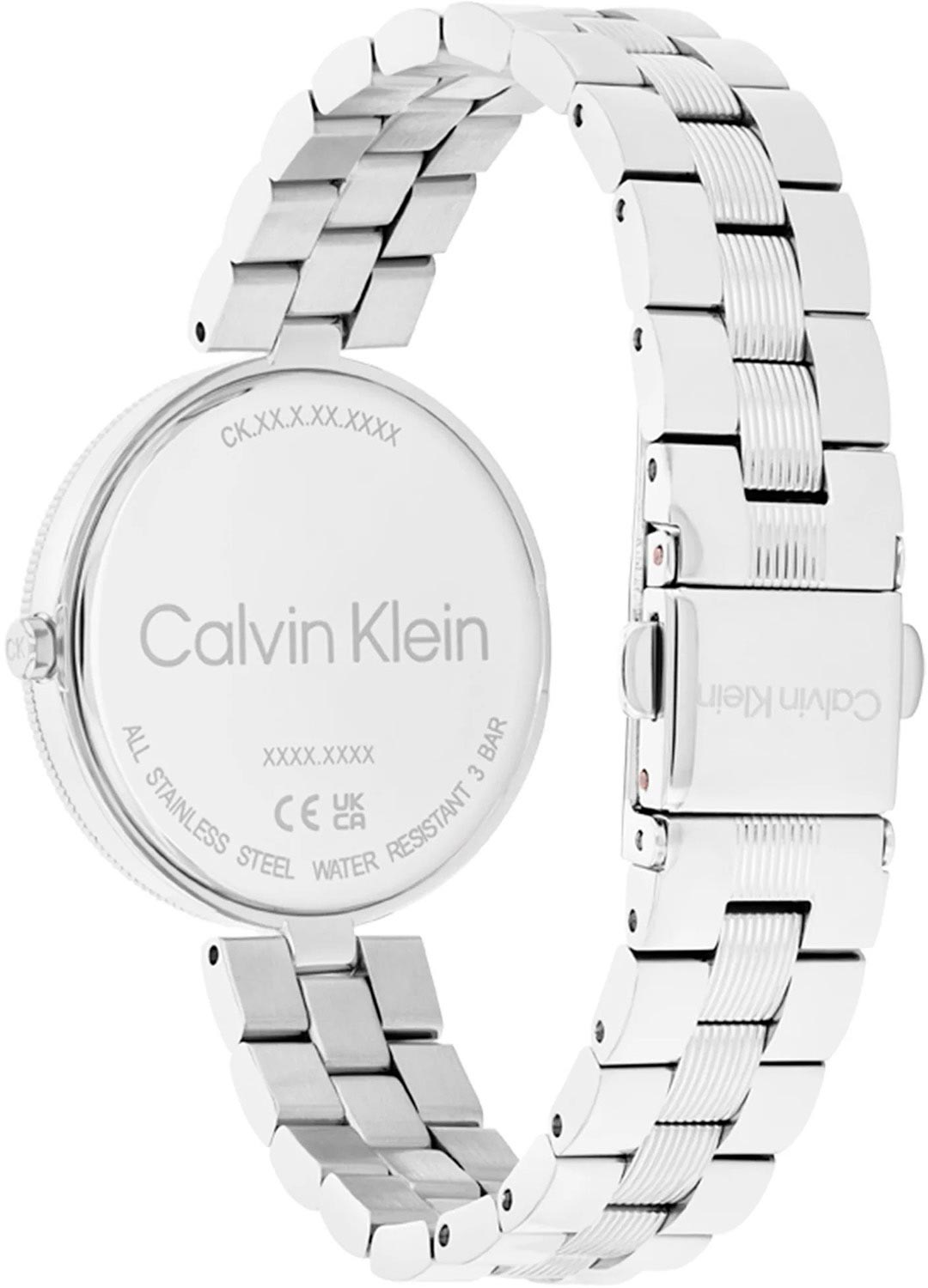 Циферблат выполнен по технологии Sunray (солнечные лучи), украшен фирменным логотипом Calvin Klein и защищен минеральным стеклом. Метки отсутствуют. Прямоугольные стрелки в стиле Baton. Секундная стрелка отсутствует.