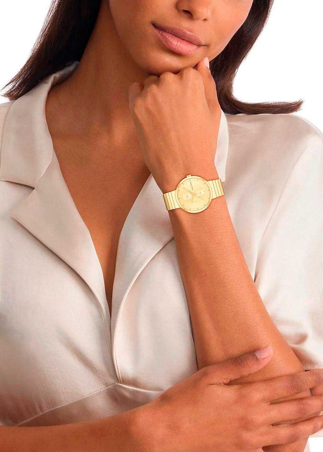 Мультифункциональные наручные женские часы. Круглый стальной корпус с матовой и полированной отделкой.