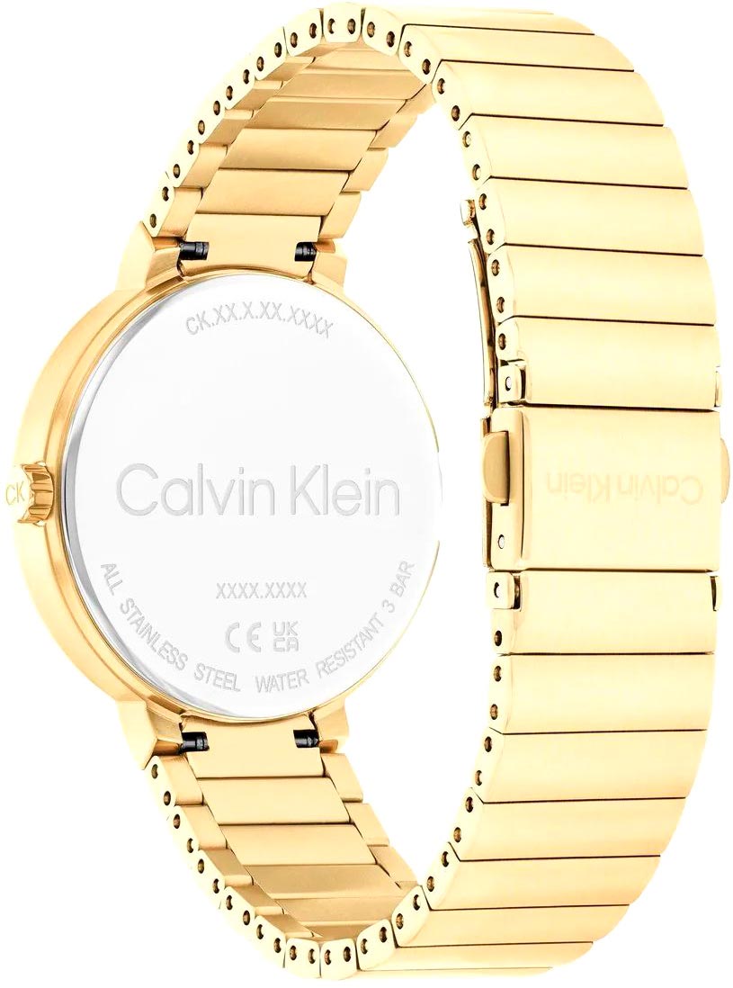 Рифленая заводная головка украшена логотипом ''CK''. Стальной браслет с плоскими звеньями матовой отделки. Раскладывающаяся застежка, украшенная логотипом бренда.