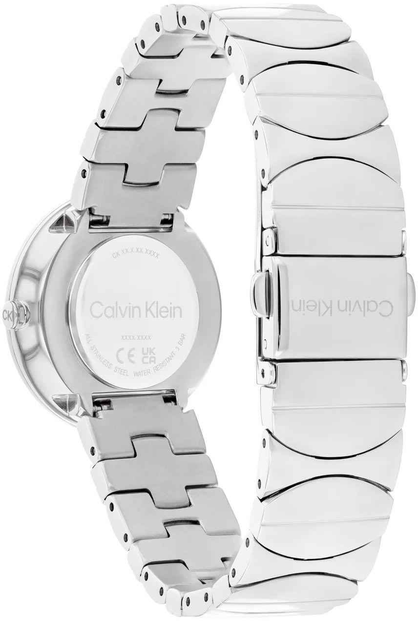 Накладные метки в виде штрихов. Прямоугольные стрелки в стиле Baton. Секундная стрелка отсутствует. Заводная головка украшена логотипом ''CK''. Стальной браслет со звеньями волнообразной формы. Раскладывающаяся застежка с двумя кнопками и логотипом бренда Calvin Klein.