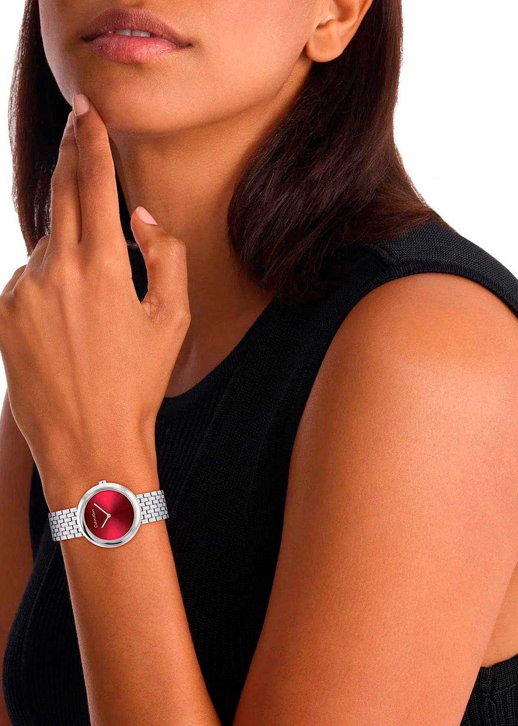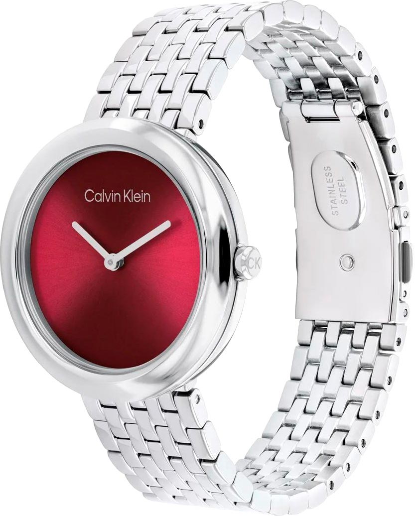Циферблат без меток выполнен по технологии Sunray (солнечные лучи) и украшен фирменным логотипом Calvin Klein. Прямоугольные стрелки в стиле Baton. Секундная стрелка отсутствует.