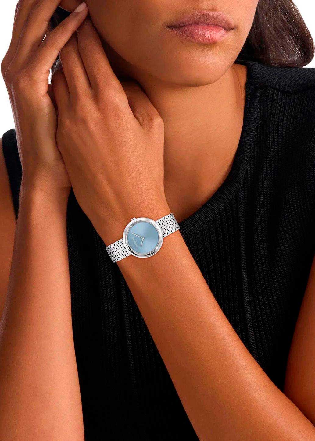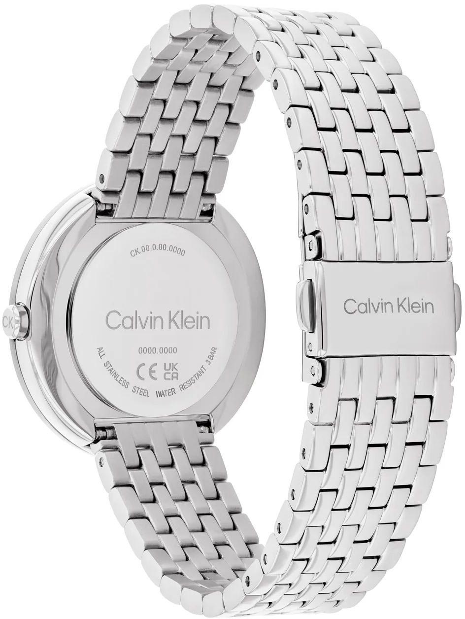 Циферблат без меток выполнен по технологии Sunray (солнечные лучи) и украшен фирменным логотипом Calvin Klein. Прямоугольные стрелки в стиле Baton. Секундная стрелка отсутствует.