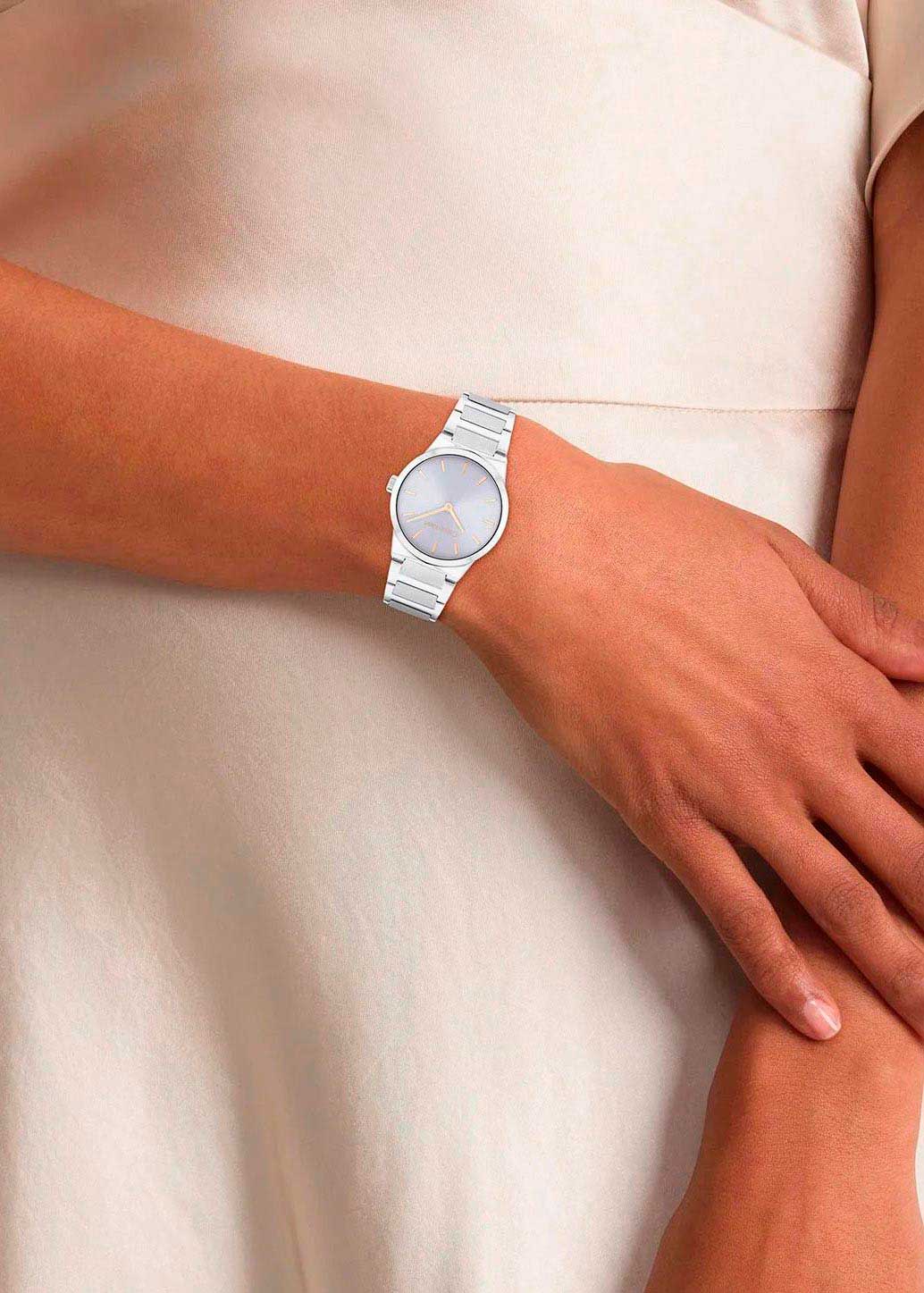 Кварцевые наручные женские часы. Круглый стальной корпус с матовой и полированной отделкой. Циферблат выполнен по технологии Sunray (солнечные лучи), украшен фирменным логотипом Calvin Klein и защищен минеральным стеклом.
