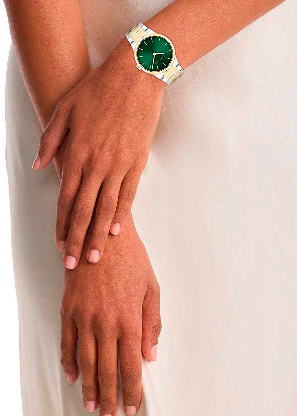 Накладные метки в виде штрихов. Прямоугольные стрелки в стиле Baton. Секундная стрелка отсутствует. Рифленая заводная головка украшена логотипом ''ck''.