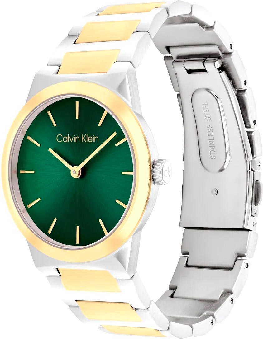 Кварцевые наручные женские часы. Круглый стальной корпус с матовой и полированной отделкой. Циферблат выполнен по технологии Sunray (солнечные лучи), украшен фирменным логотипом Calvin Klein и защищен минеральным стеклом.