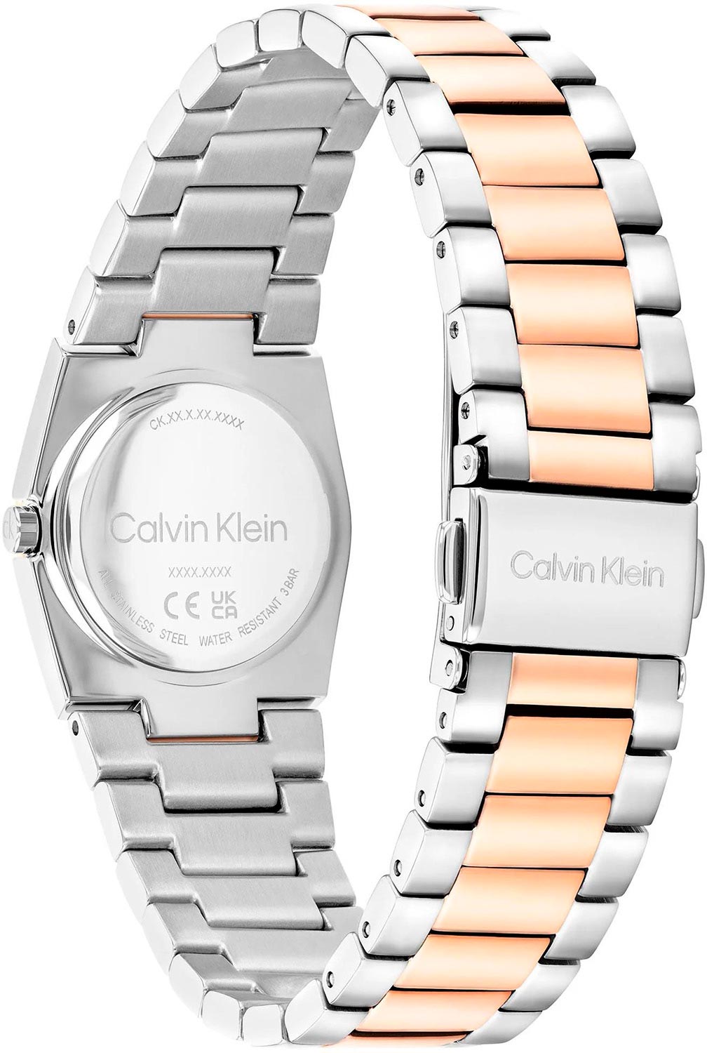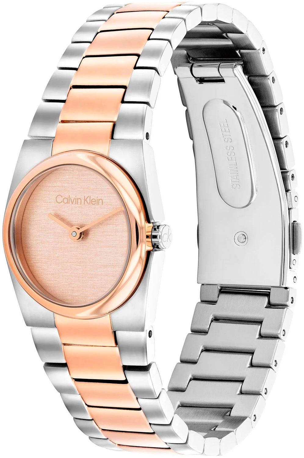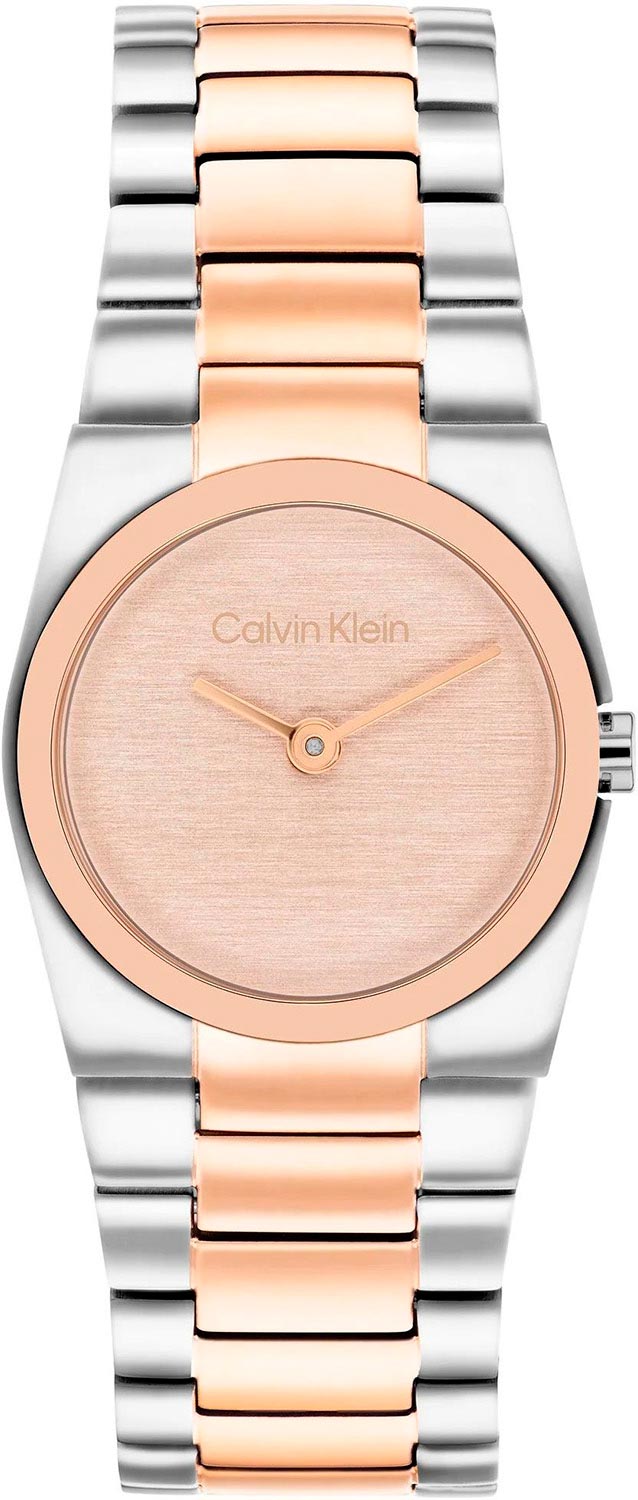 Женские наручные кварцевые часы. Круглый стальной корпус с матовой и полированной отделкой. Текстурированный циферблат без меток, украшен фирменным логотипом Calvin Klein и защищен минеральным стеклом.