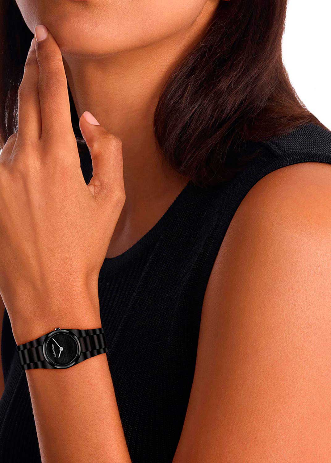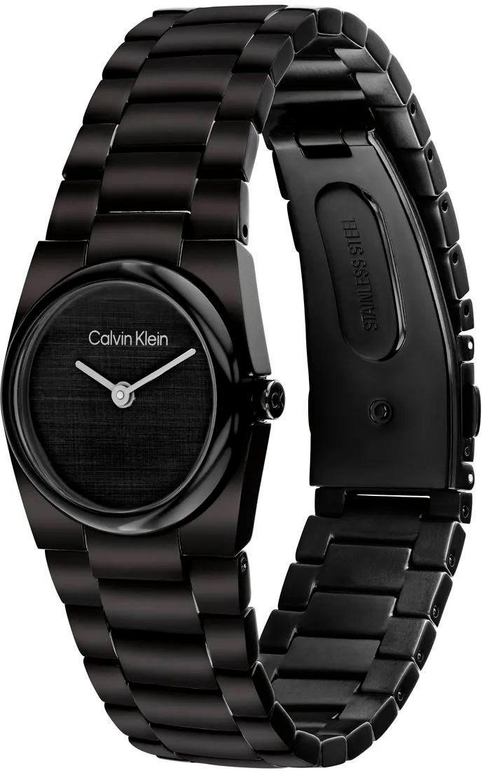 Женские наручные кварцевые часы. Круглый стальной корпус с матовой и полированной отделкой. Текстурированный циферблат без меток, украшен фирменным логотипом Calvin Klein и защищен минеральным стеклом.