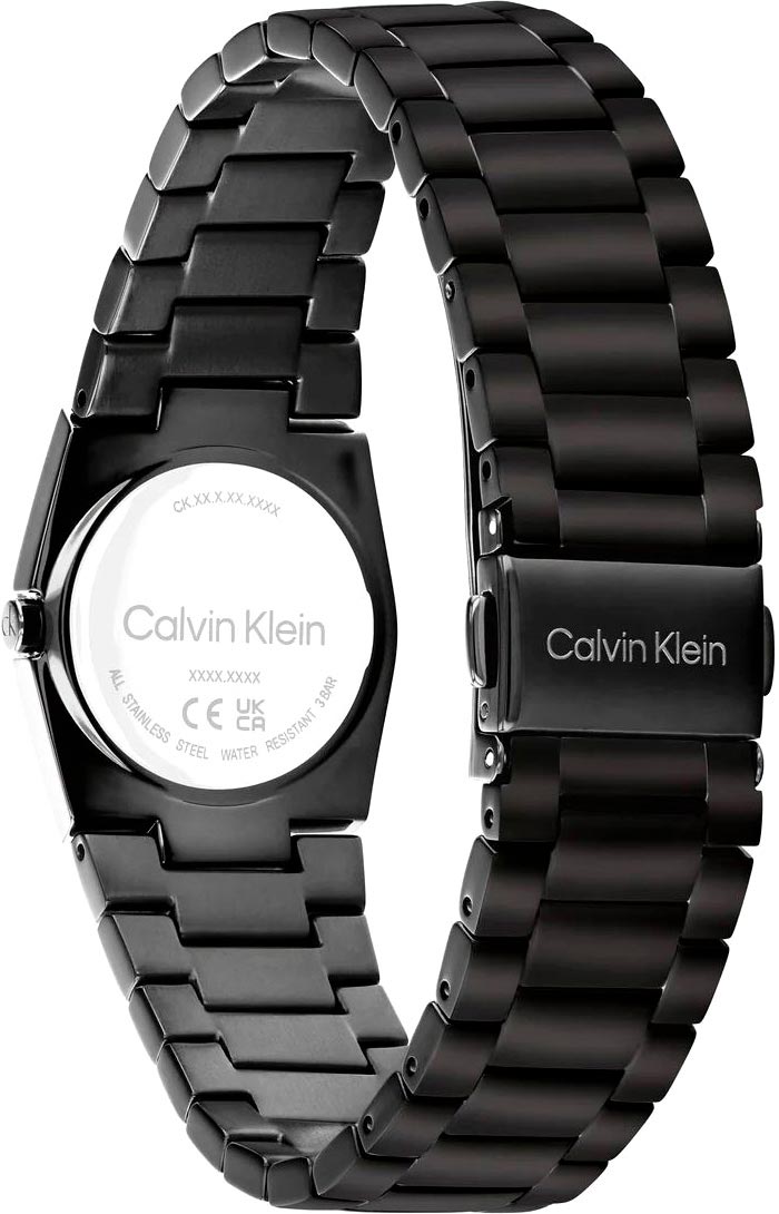 Скругленные прямоугольные стрелки в стиле Baton. Секундная стрелка отсутствует. Рифленая заводная головка украшена логотипом ''ck''.