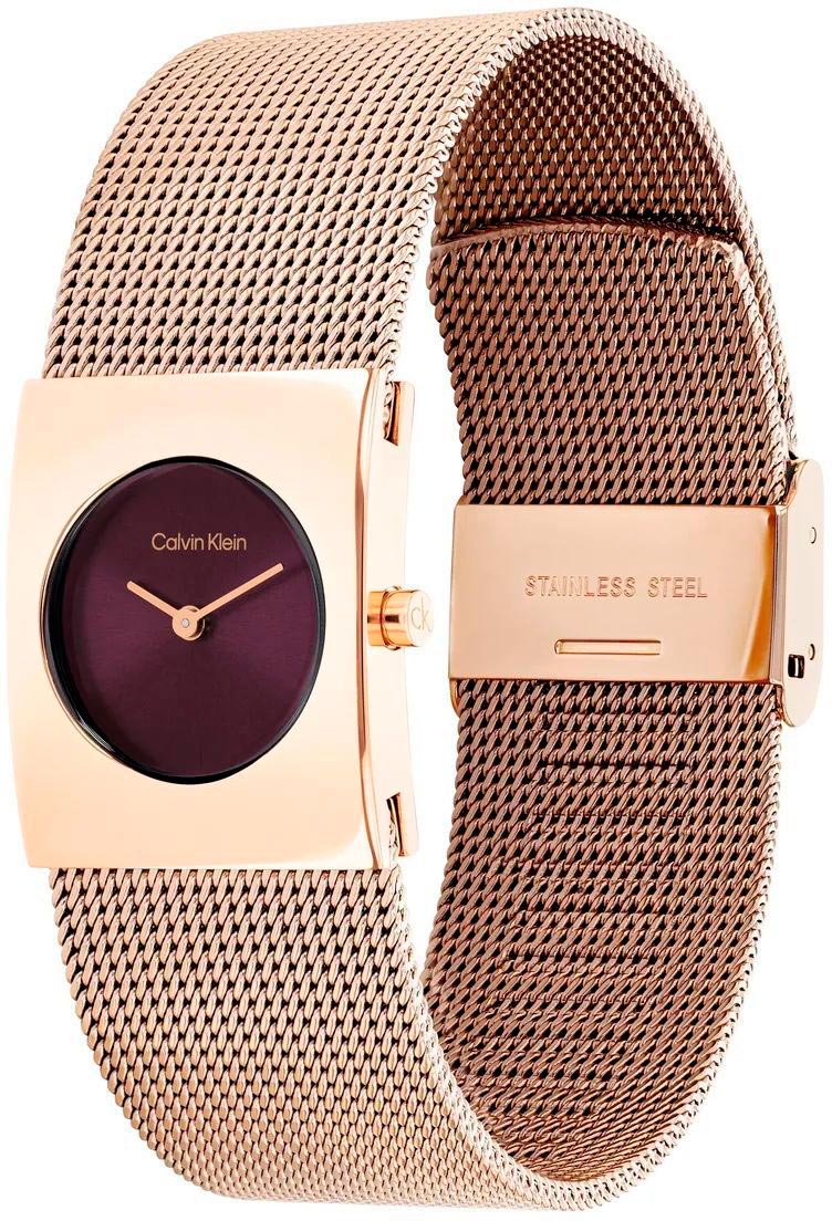 Гладкая заводная головка украшена логотипом ''CK''. Стальной браслет миланского плетения с регулируемой застежкой, украшенной логотипом бренда Calvin Klein.