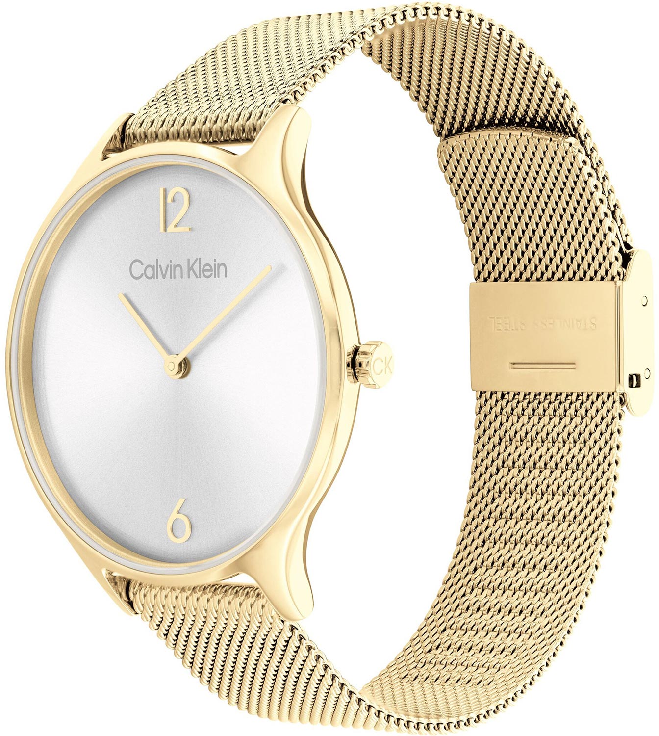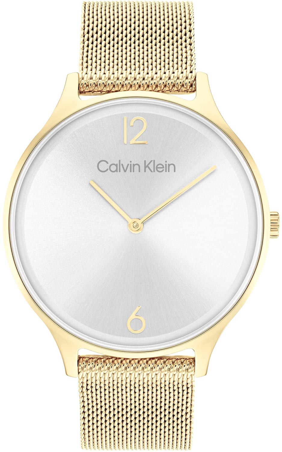 Аккуратный лаконичный дизайн и четкие линии этих стильных часов позволяют носить их с любым образом. Наручные женские часы Timeless Mesh. Круглый стальной корпус с полированной отделкой. Циферблат выполнен по технологии Sunray (солнечные лучи) и украшен фирменным логотипом Calvin Klein. Накладные метки в виде арабских цифр. Прямоугольные стрелки в стиле Baton. Рифленая заводная головка украшена логотипом ''ck''. Удобный и надежный стальной браслет миланского плетения с регулируемой застежкой.