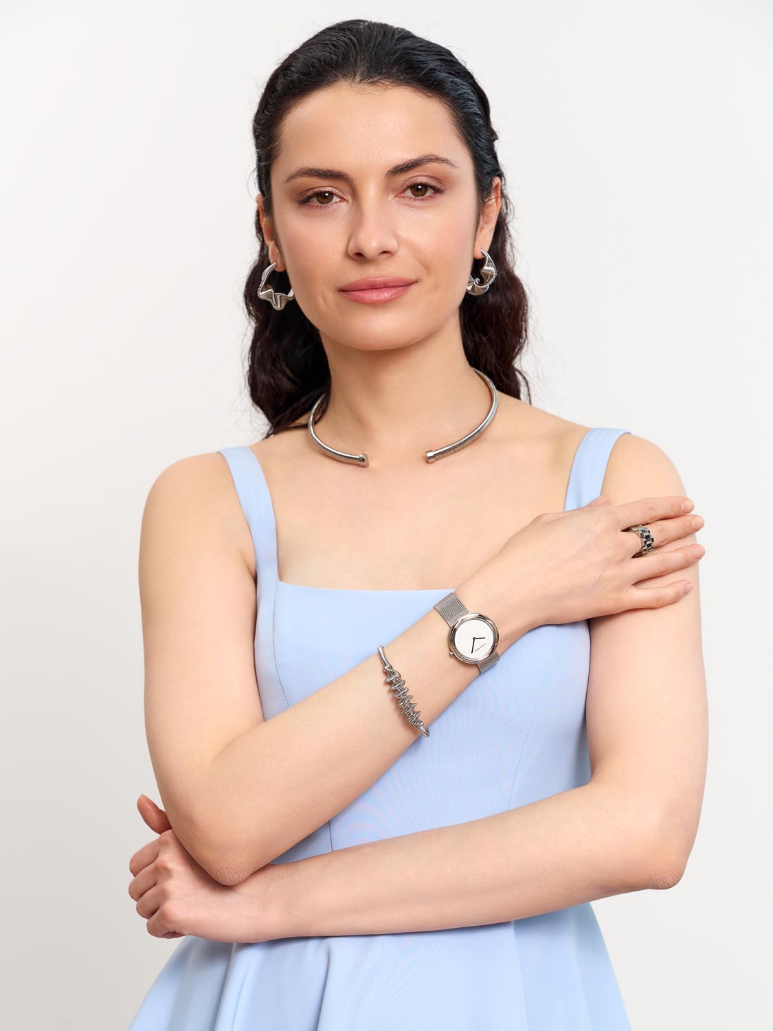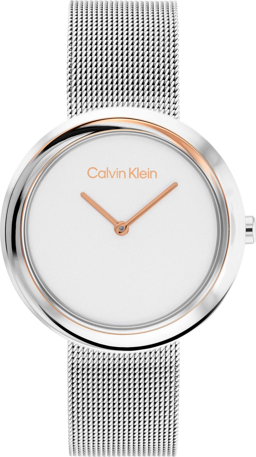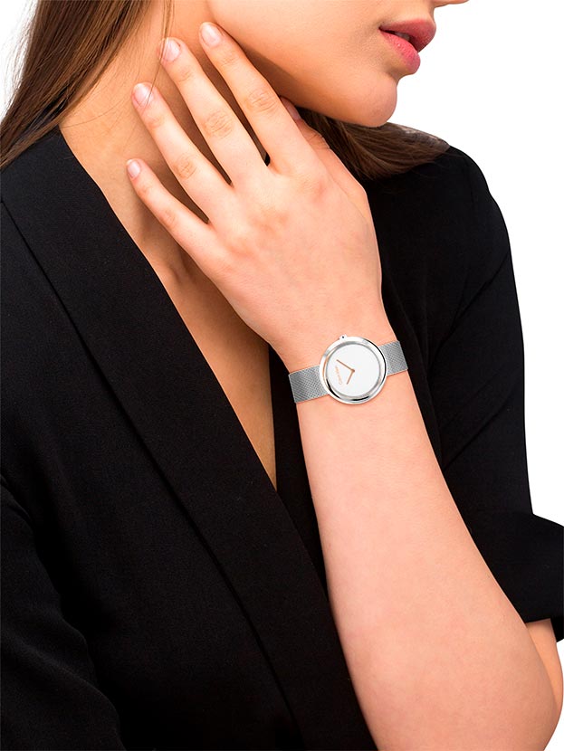 Отличный аксессуар для современной бизнес-леди. Эти лаконичные часы великолепно дополнят деловой стиль. Женские наручные кварцевые часы. Круглый стальной корпус. Закрученный безель с матовой и полированной отделкой. Матовый циферблат без меток, украшен фирменным логотипом Calvin Klein. Прямоугольные стрелки в стиле Baton. Гладкая заводная головка украшена логотипом ''ck''. Удобный и надежный стальной браслет миланского плетения с регулируемой застежкой.