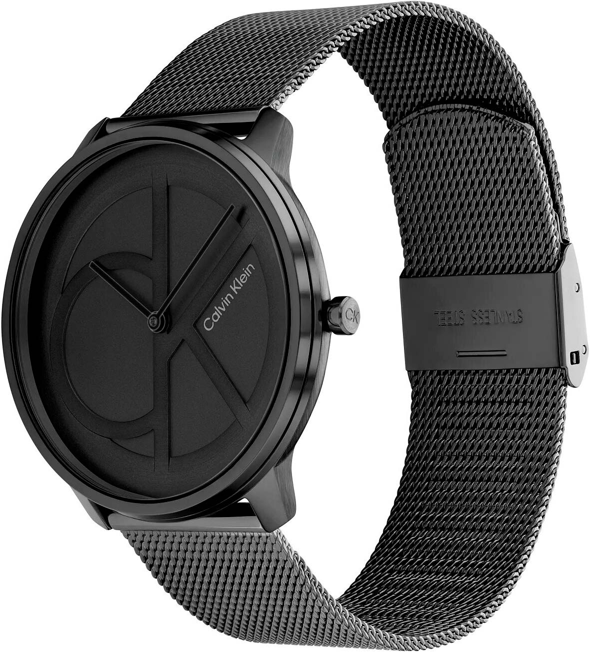 Эти стильные часы - воплощение минимализма и элегантности, которые добавляют шарма любому образу и подчеркивают вашу индивидуальность. Кварцевые часы унисекс Iconic Mesh. Корпус круглой формы из нержавеющей стали с черным IP покрытием. Циферблат без меток с большим фирменным логотипом CK защищен минеральным стеклом. Прямоугольные стрелки в стиле Baton. Секундная стредка отсутствует. Заводная головка украшена логотипом ''CK''. Стальной браслет миланского плетения с черным IP покрытием. Застежка с логотипом бренда Calvin Klein.