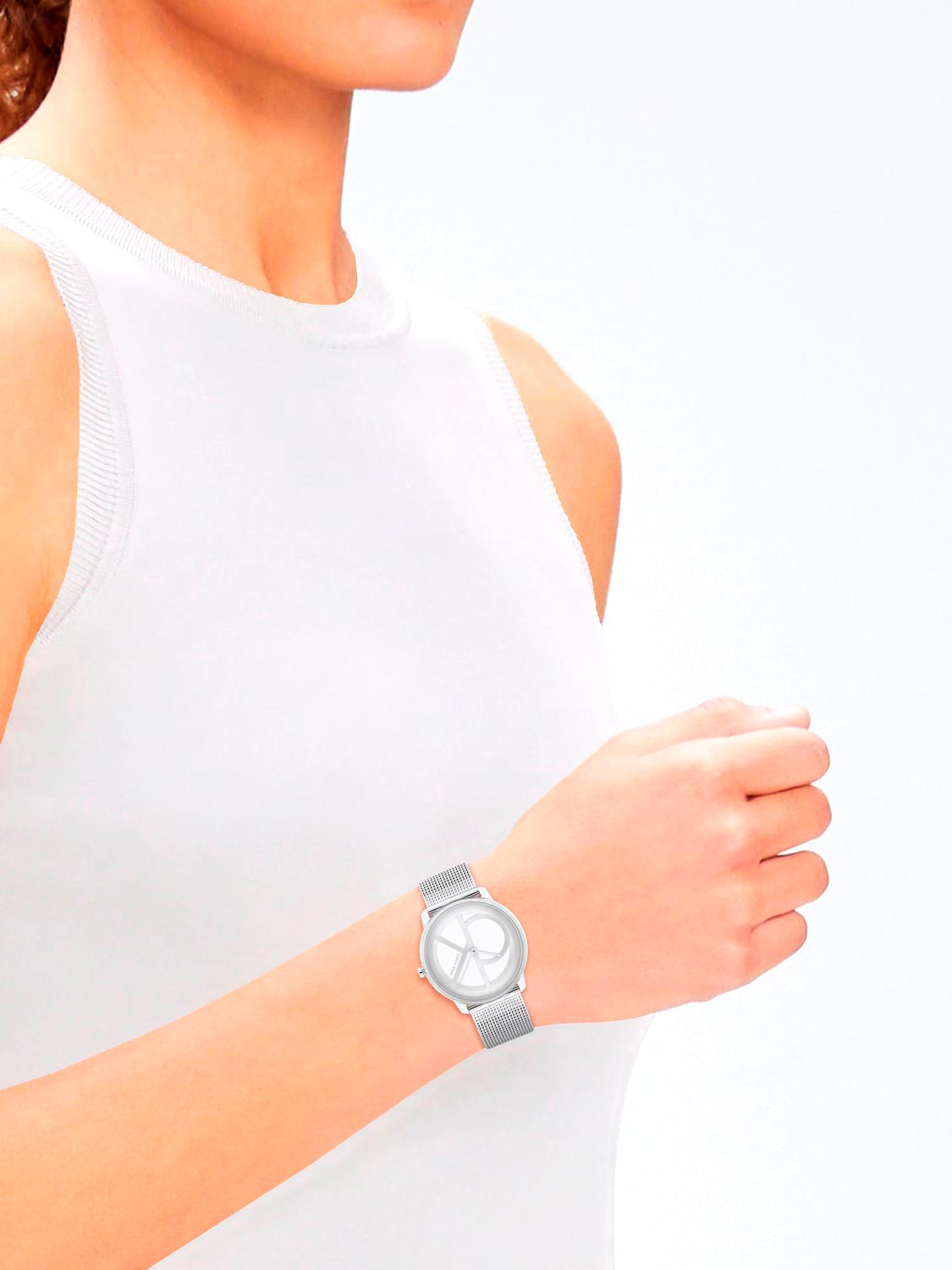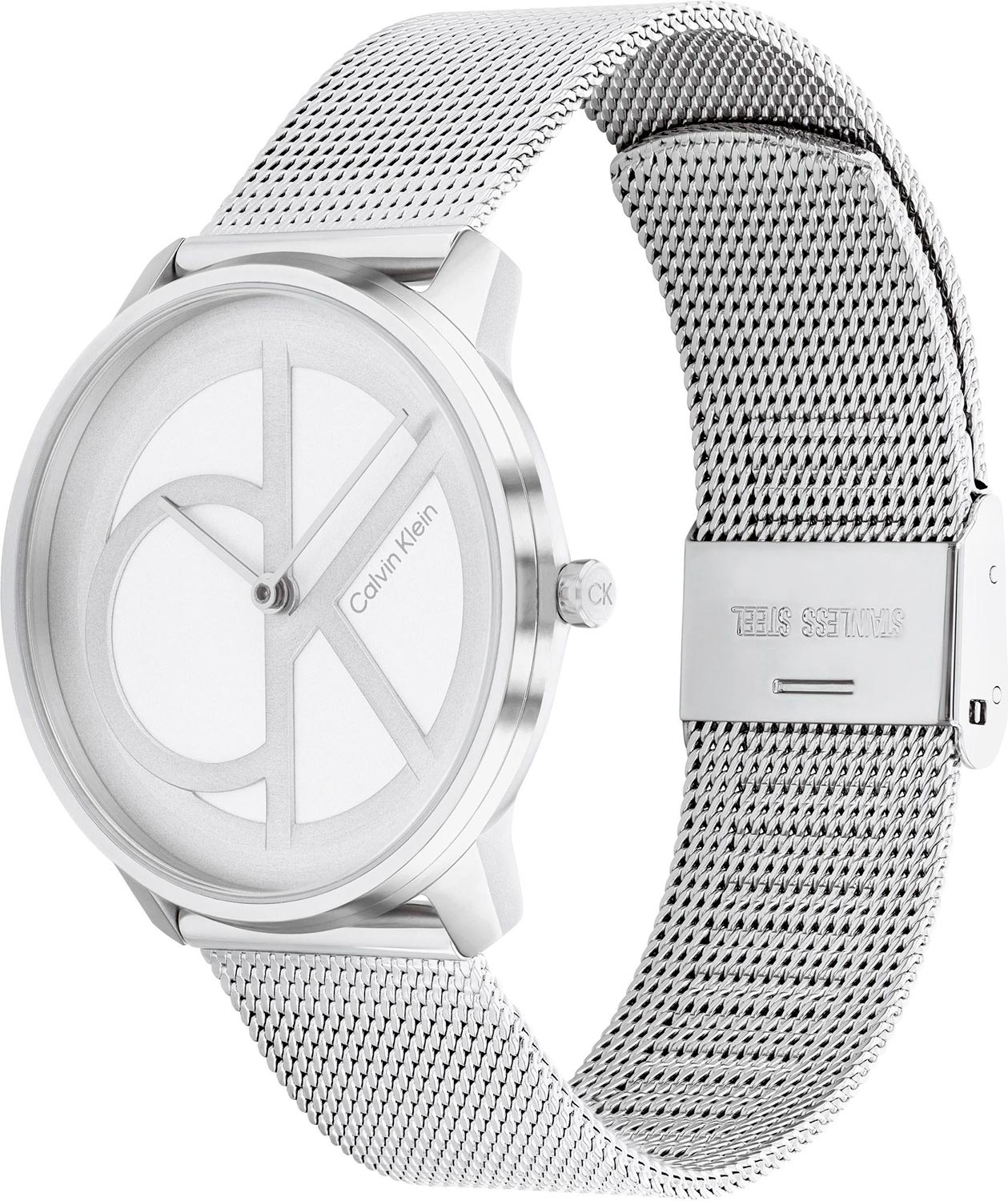 Наручные часы Iconic Mesh. Круглый стальной корпус с матовой и полированной отделкой. Двухуровневый циферблат без меток с большим фирменным логотипом Calvin Klein. Прямоугольные стрелки в стиле Baton. Гладкая заводная головка украшена логотипом ''ck''. Удобный и надежный стальной браслет миланского плетения с регулируемой застежкой.