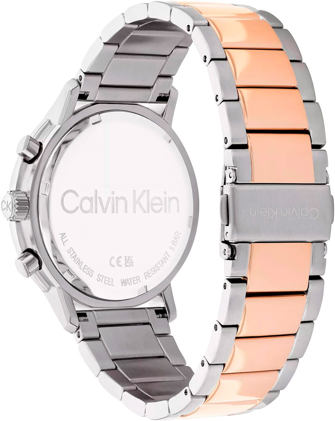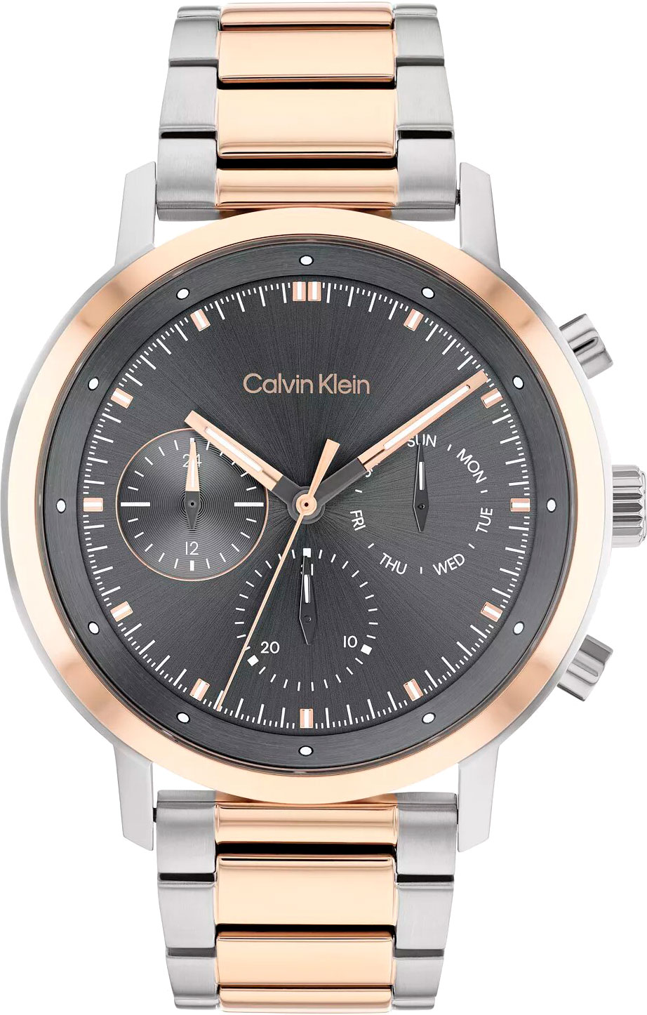 Элегантные и стильные часы излучают изысканность и обеспечивают точное измерение времени для всех ваших повседневных дел. Мужские кварцевые часы. Корпус круглой формы из нержавеющей стали с частичным розовым IP покрытием. Циферблат с метками в виде штрихов выполнен по технологии Sunray (солнечные лучи), украшен фирменным логотипом Calvin Klein и защищен минеральным стеклом. Метки и стрелки с люминесцентным покрытием, которое светится в темноте после непродолжительной зарядки на свету. Дата, день недели вынесены на отдельные циферблаты. 12-ти и 24-х часовой формат времени. Рифленая заводная головка украшена логотипом ''CK''. Надежный стальной браслет с частичным розовым IP покрытием и раскладывающейся застежкой с двумя кнопками и логотипом бренда Calvin Klein.