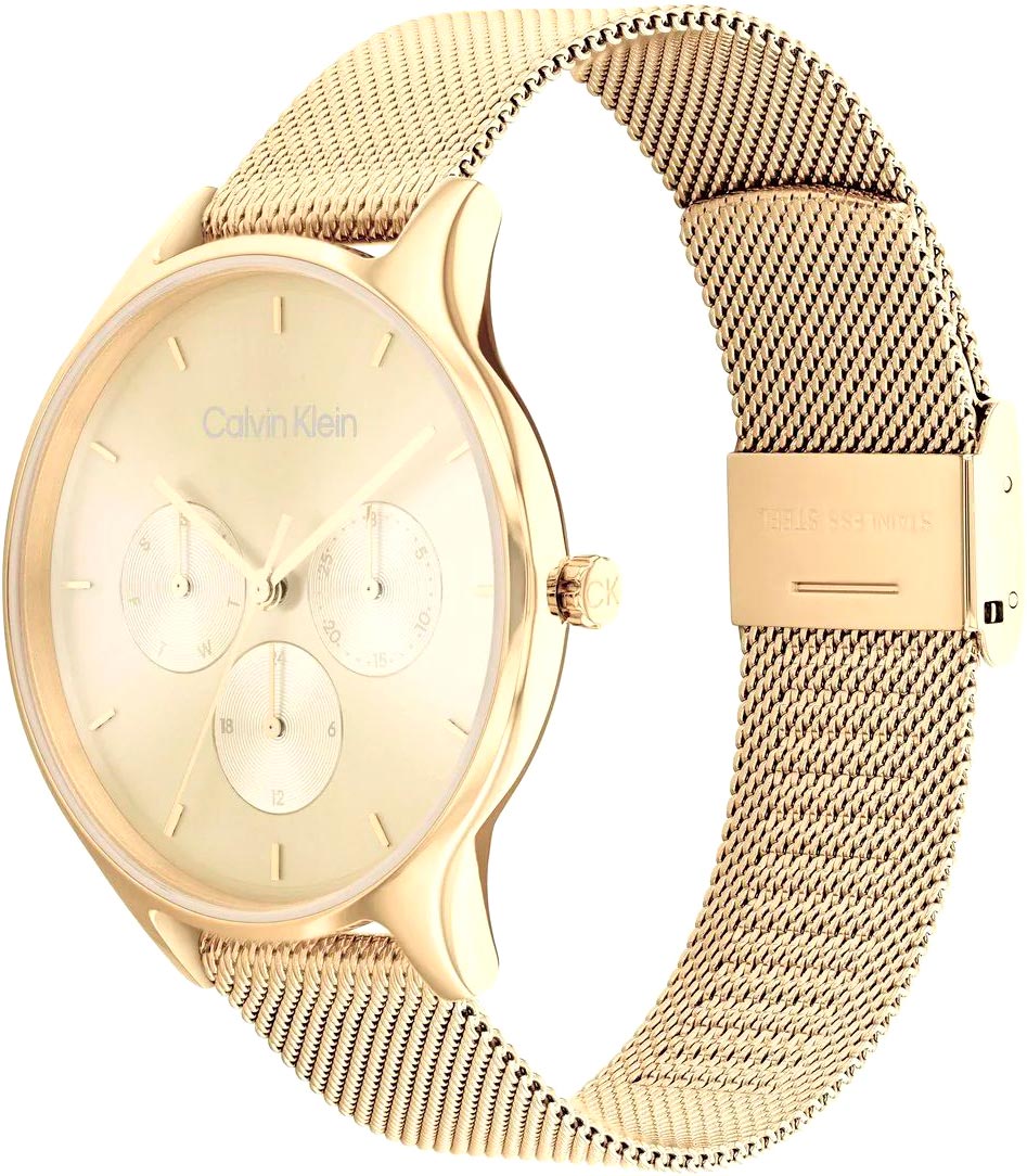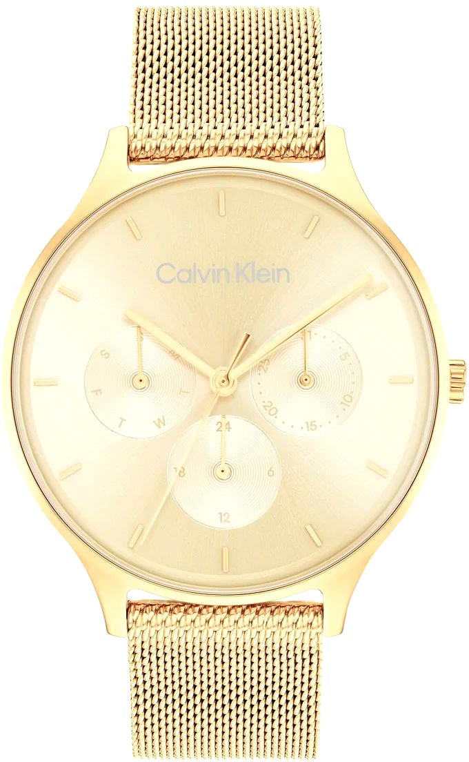Эти функциональные часы придутся по вкусу ценительницам практичных и стильных часов. Идеальный выбор для современного ритма жизни. Женские наручные часы с круглым стальным корпусом Timeless Mesh. 12-ти и 24-х часовой формат времени. Циферблат выполнен по технологии Sunray (солнечные лучи) и украшен фирменным логотипом Calvin Klein. Накладные метки в виде штрихов. Дата и день недели вынесены на отдельные циферблаты. Заводная головка украшена логотипом ''ck''. Браслет миланского плетения.
