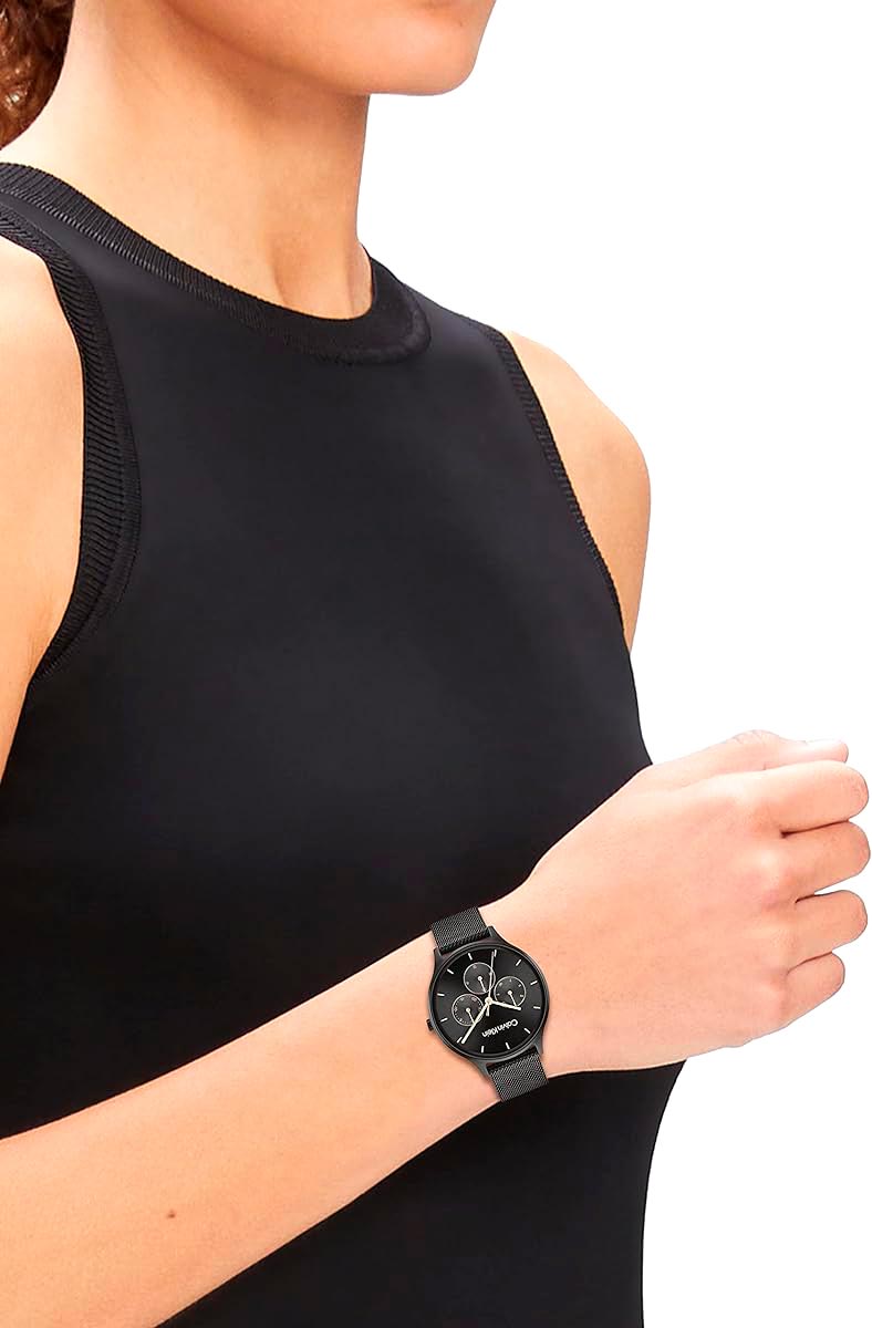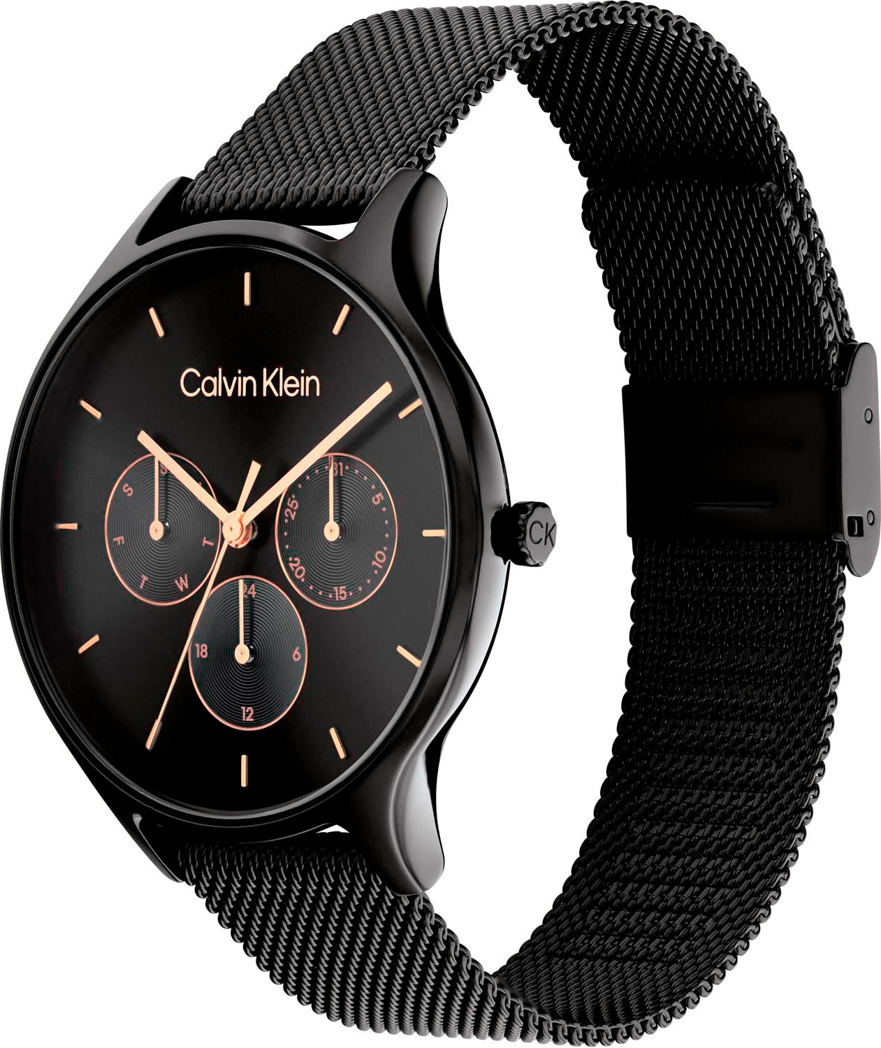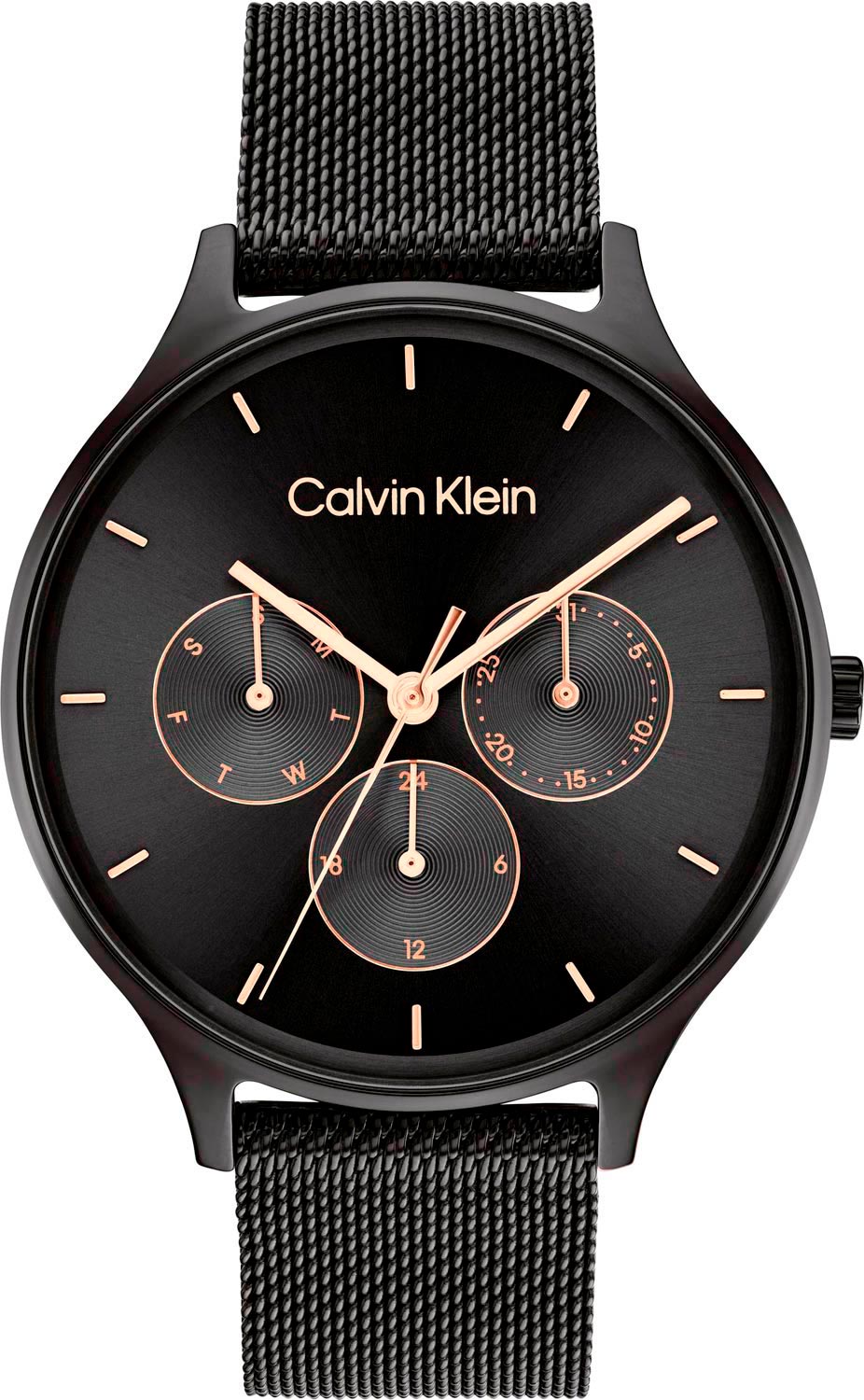 Прекрасное сочетание элегантности и практичности. Отличный вариант для дополнения вашего стиля. Наручные женские часы Timeless Mesh. Круглый стальной корпус с полированной отделкой. 12-ти и 24-х часовой формат времени. Циферблат выполнен по технологии Sunray (солнечные лучи) и украшен фирменным логотипом Calvin Klein. Накладные метки в виде штрихов. Дата и день недели вынесены на отдельные циферблаты. Прямоугольные стрелки в стиле Baton. Рифленая заводная головка украшена логотипом ''ck''. Надежный стальной браслет миланского плетения с регулируемой застежкой.