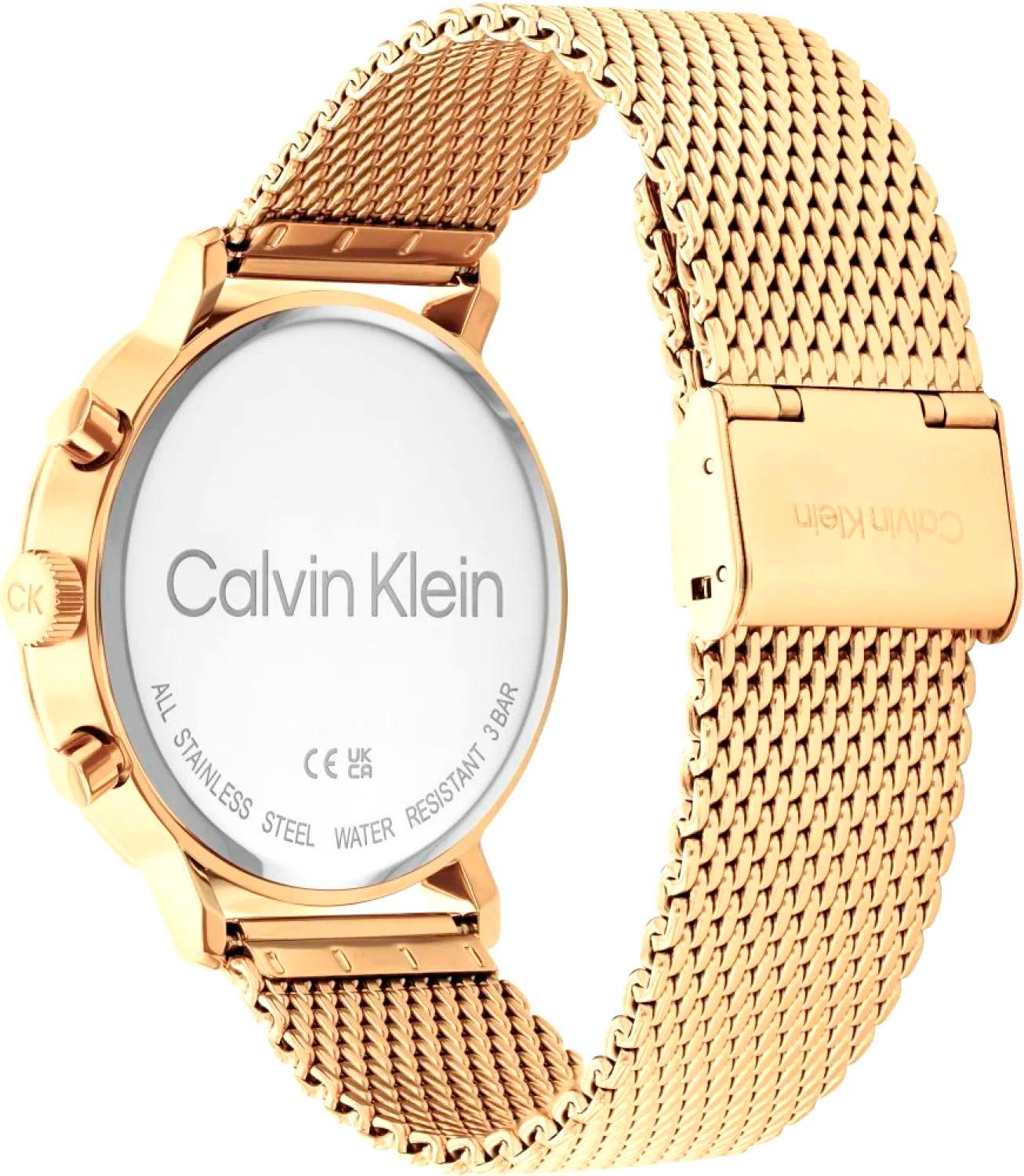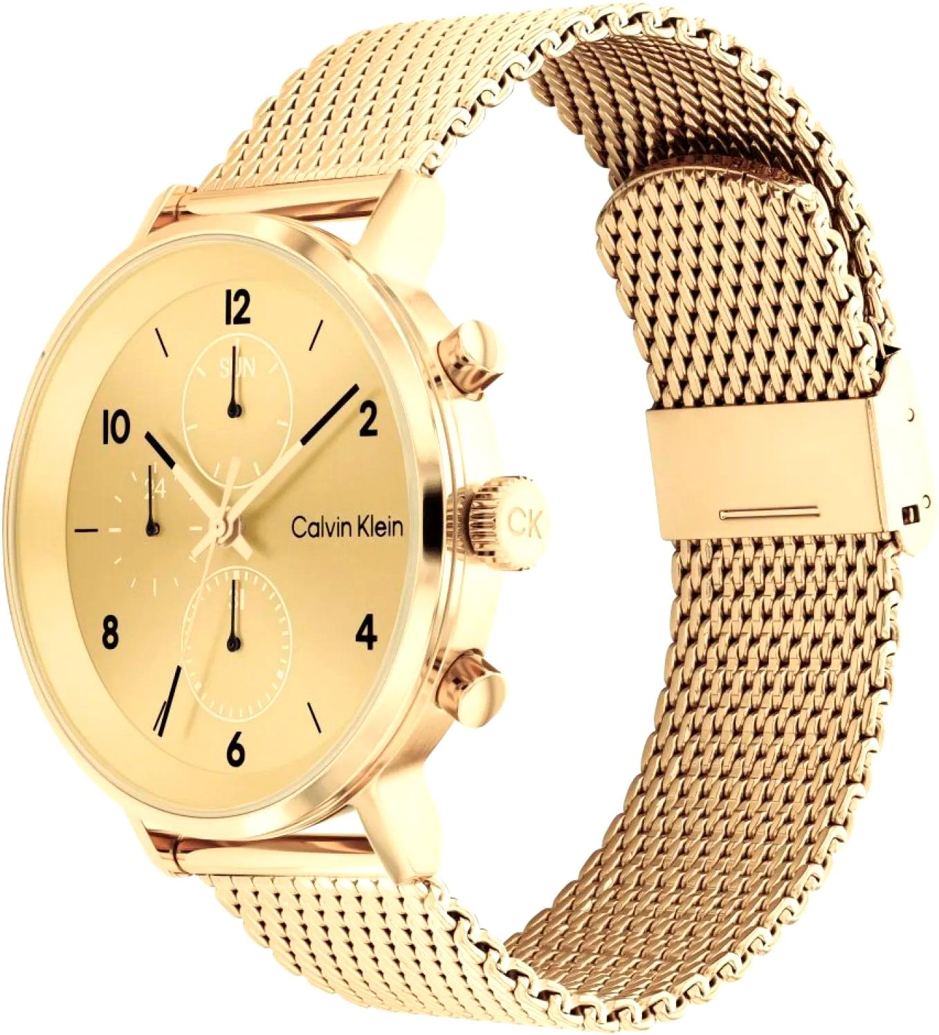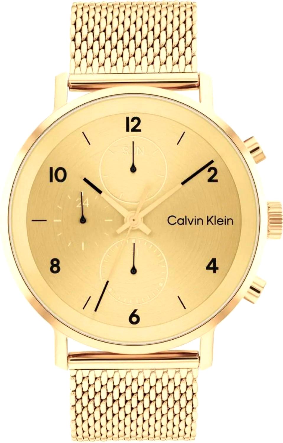 Великолепные многофункциональные часы обладают собственным неповторимым стилем. Неотъемлемый аксессуар вашего статуса. Наручные кварцевые часы Modern Multi. Круглый стальной корпус. 12-ти и 24-х часовой формат времени. Циферблат выполнен по технологии Sunray (солнечные лучи) и украшен фирменным логотипом Calvin Klein. Накладные метки в виде штрихов и арабских цифр. Дата и день недели вынесены на отдельные циферблаты. Заводная головка украшена логотипом ''ck''. Браслет миланского плетения.