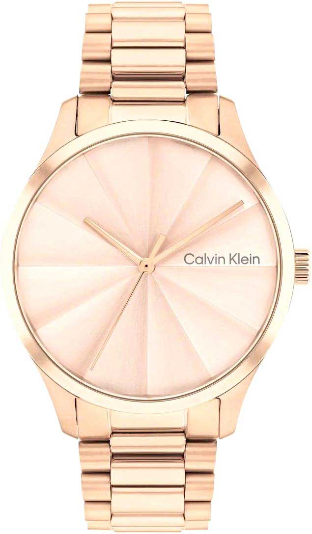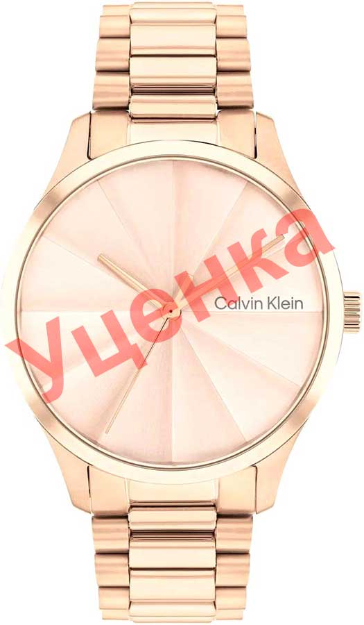 Уценка. 3 модели. Царапины на корпусе и безеле. Наручные кварцевые часы унисекс. Круглый стальной корпус. Циферблат выполнен по технологии Sunray (солнечные лучи) с эффектом структуры лопастей и украшен фирменным логотипом Calvin Klein. Без меток. Заводная головка украшена логотипом ''ck''. Стальной браслет с раскладывающейся застежкой.