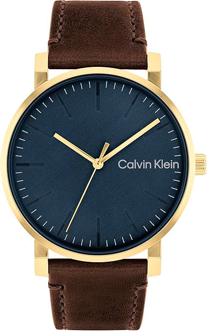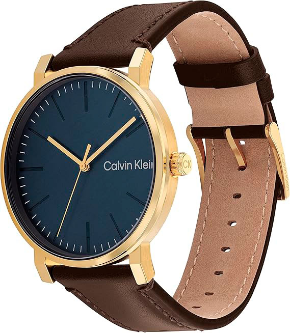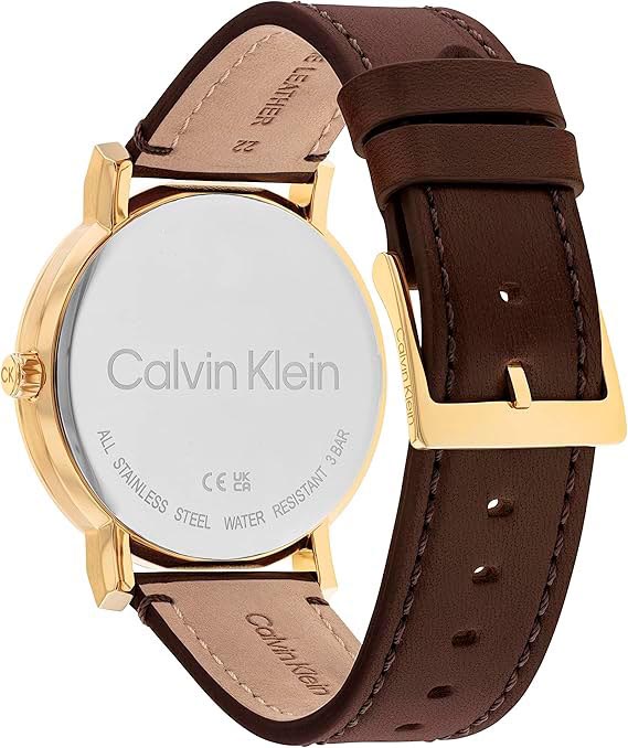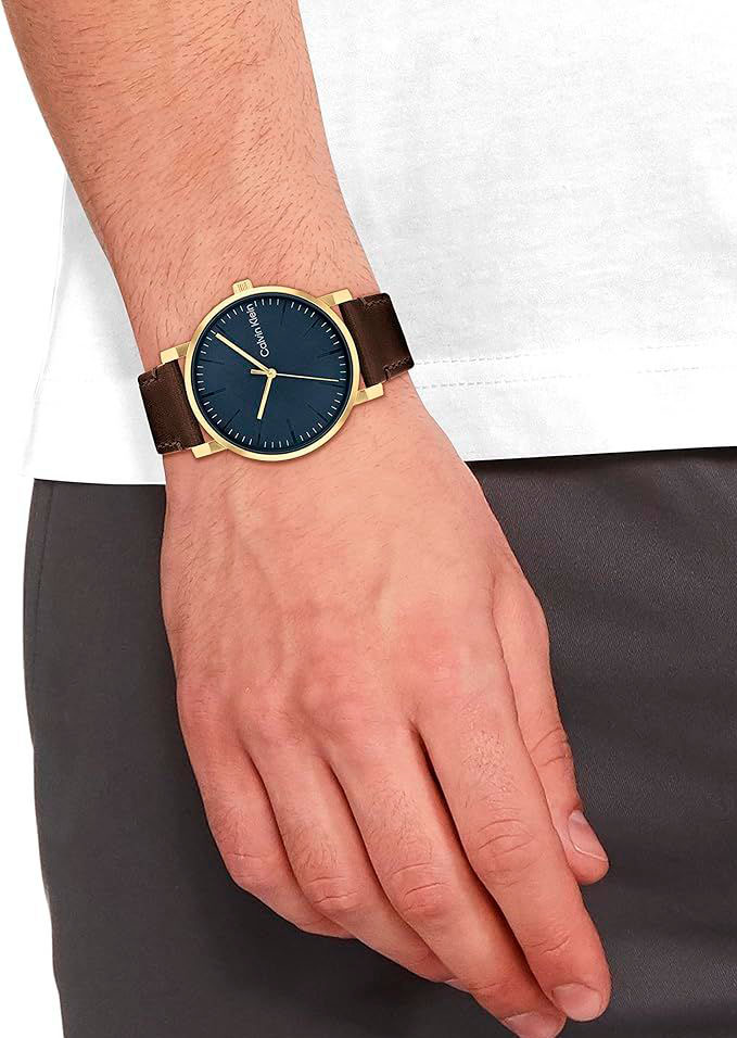 Элегантные мужские часы в стильном классическом дизайне станут идеальным выбором на каждый день. Мужские часы с круглым стальным корпусом. Циферблат с метками в виде штрихов украшен фирменным логотипом ''Calvin Klein''. Рифленая заводная головка. Кожаный ремешок с классической застежкой.