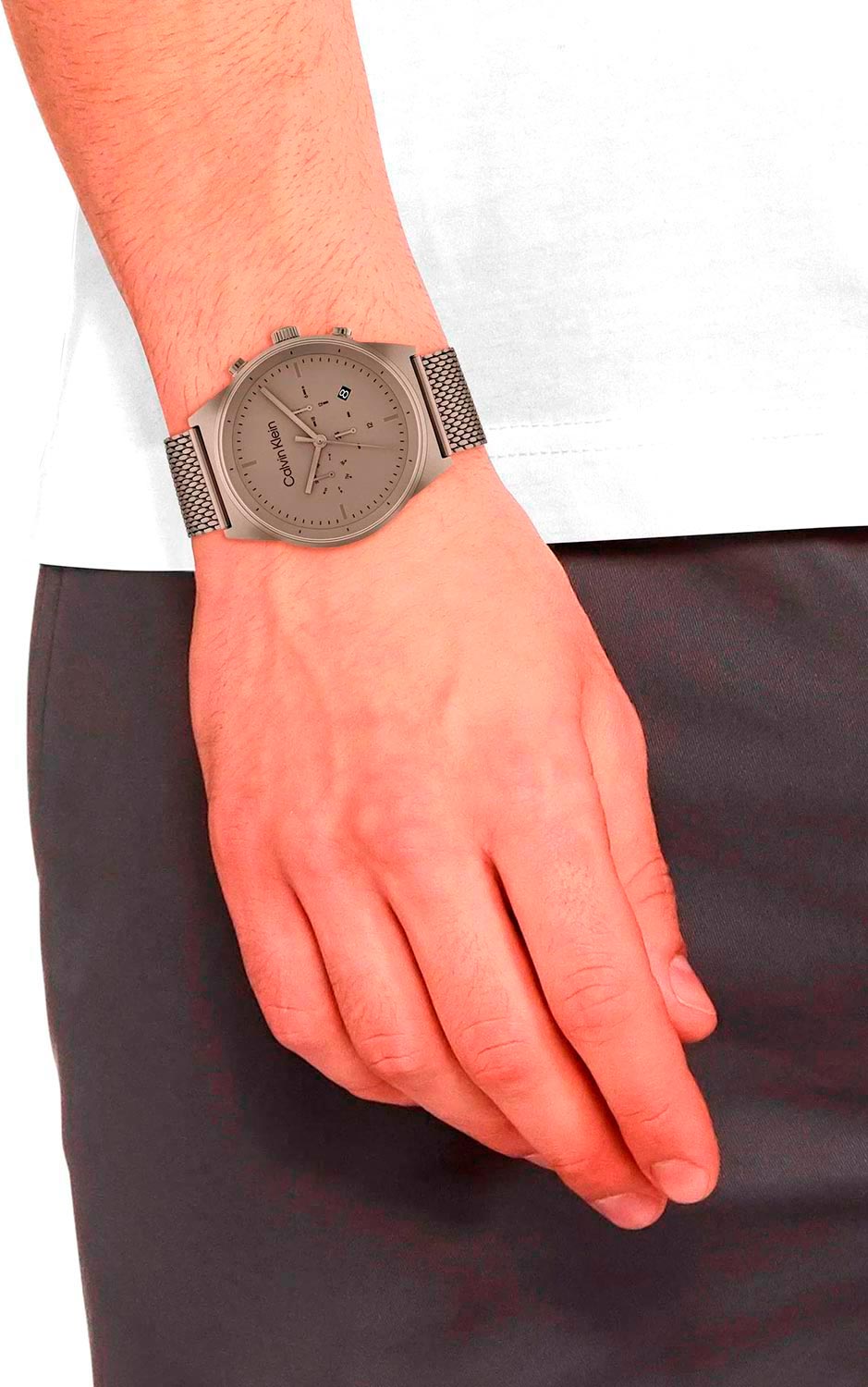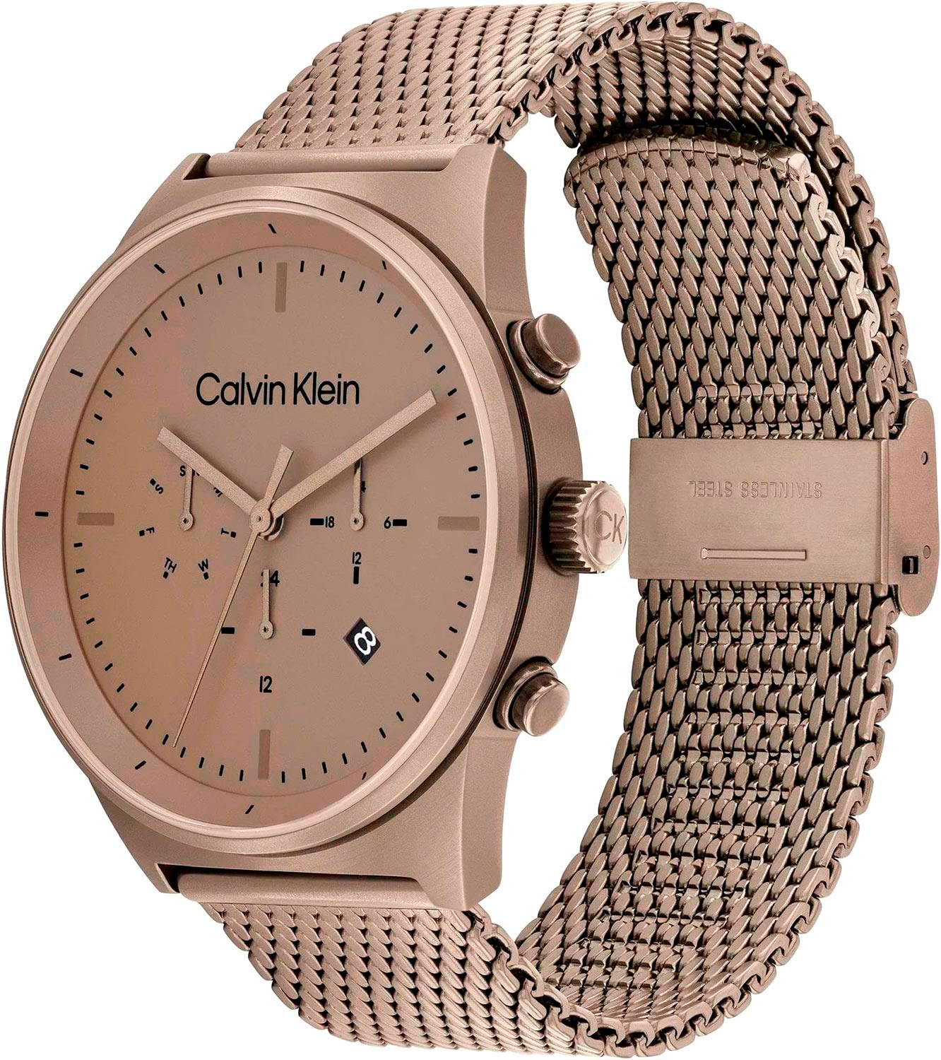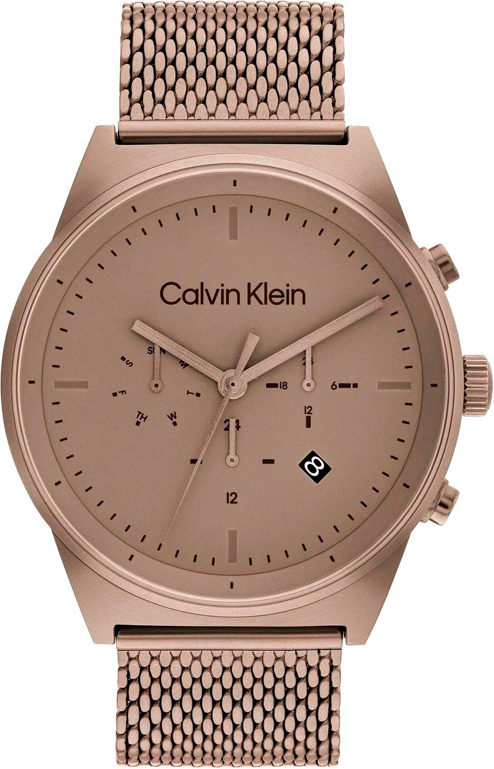 С этими функциональными часами вы легко сможете проявить себя и показать окружающим свое изумительное чувство вкуса. Функциональные мужские наручные часы. Круглый стальной корпус с матовой и полированной отделкой. Матовый циферблат с фирменным логотипом Calvin Klein. 12-ти и 24-х часовой формат времени. Второй часовой пояс в 24-х часовом формате времени, отображается на отдельном циферблате. Окошко даты находится в положении 4 часов. День недели вынесен на отдельный циферблат. Метки в виде штрихов. Прямоугольные стрелки в стиле Baton. Рифленая заводная головка украшена логотипом ''ck''. Удобный и надежный стальной браслет миланского плетения с регулируемой застежкой.