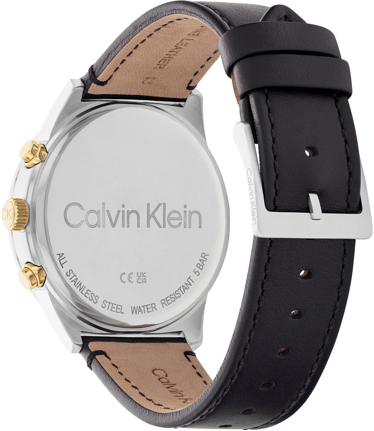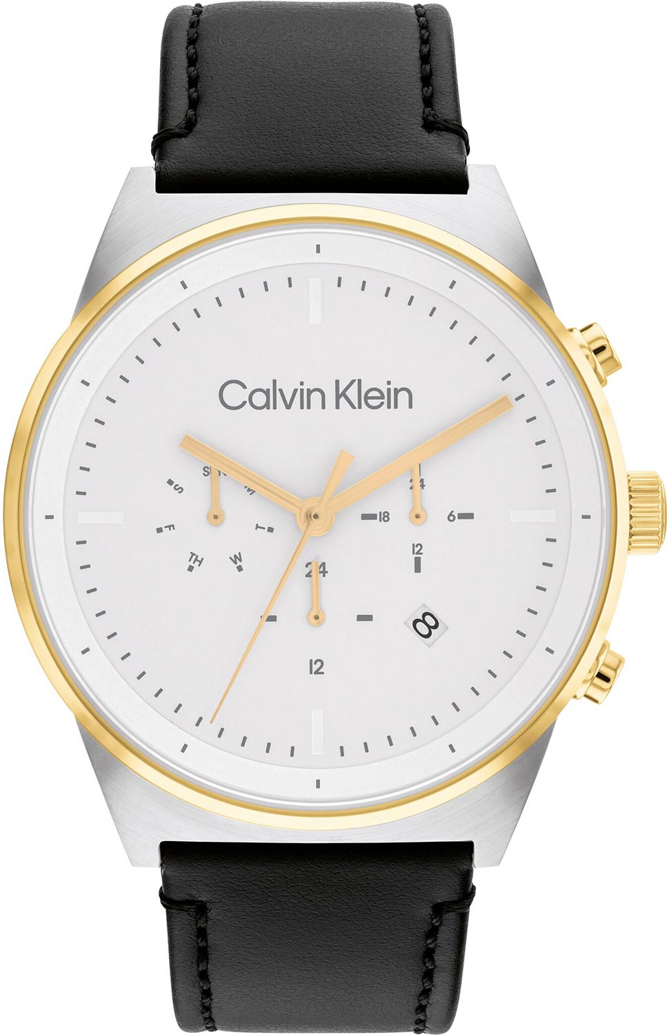 Привлекательные часы с практичным функциональным набором – достойный аксессуар для уверенного в себе, стильного молодого человека. Функциональные мужские наручные часы. Круглый стальной корпус с матовой и полированной отделкой. Матовый циферблат с фирменным логотипом Calvin Klein. 12-ти и 24-х часовой формат времени. Второй часовой пояс в 24-х часовом формате времени, отображается на отдельном циферблате. Окошко даты находится в положении 4 часов. День недели вынесен на отдельный циферблат. Метки в виде штрихов. Прямоугольные стрелки в стиле Baton. Рифленая заводная головка украшена логотипом ''ck''. Удобный кожаный ремешок с классической застежкой.