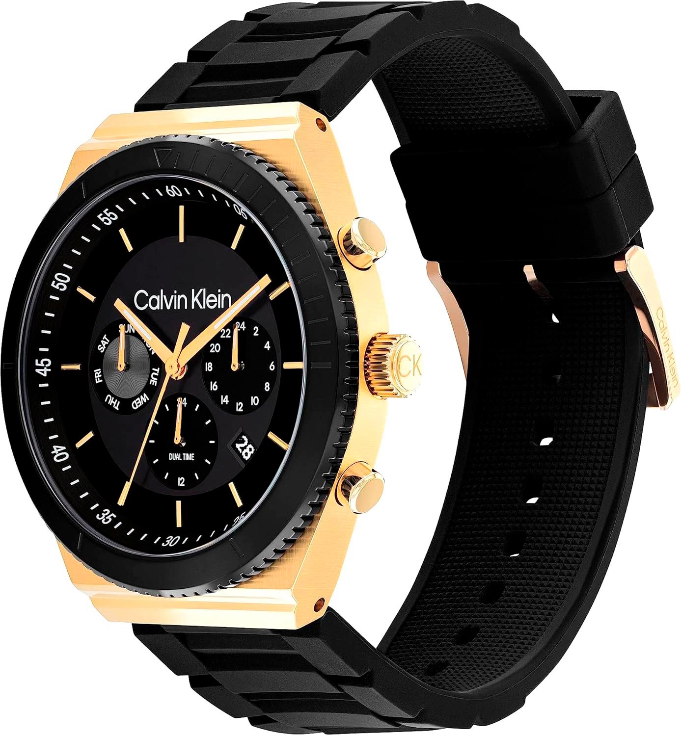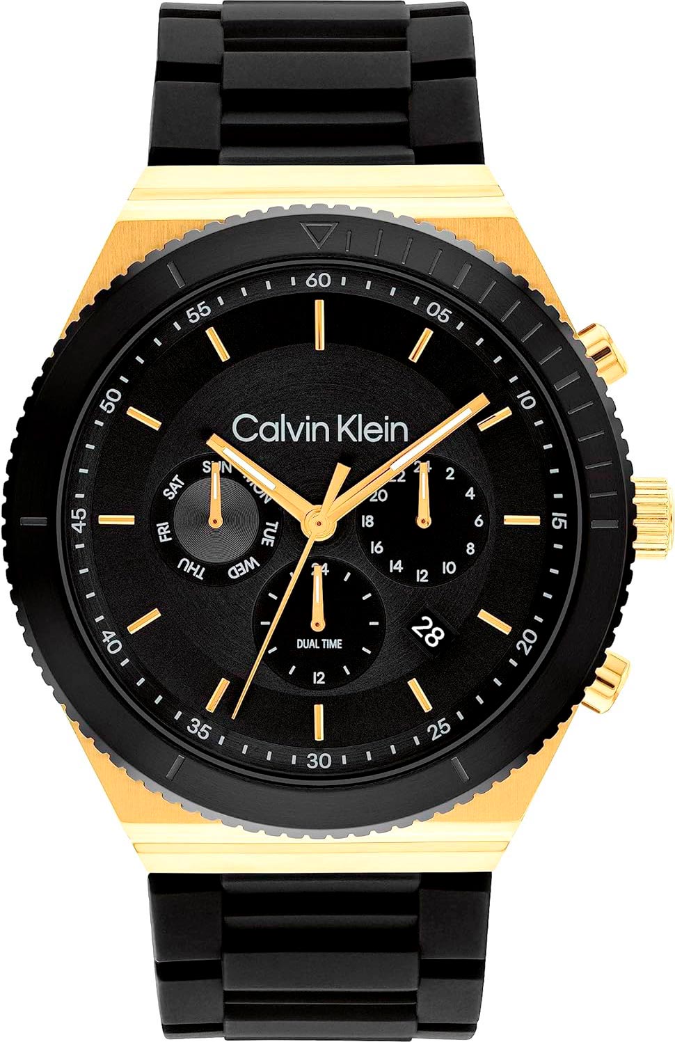 Стильные мужские часы с широким функционалом покорят вас своим практичным дизайном. Практичные мужские наручные часы. Круглый стальной корпус с матовой и полированной отделкой. Рифленый безель. Сатинированный циферблат с фирменным логотипом Calvin Klein. 12-ти и 24-х часовой формат времени. Второй часовой пояс в 24-х часовом формате времени, отображается на отдельном циферблате. Окошко даты находится между часовыми отметками 4 и 5 часов. День недели вынесен на отдельный циферблат. Метки в виде штрихов. Прямоугольные стрелки в стиле Baton с люминесцентным покрытием, которое светится в темноте после непродолжительной зарядки на свету. Рифленая заводная головка украшена логотипом ''ck''. Надежный стальной браслет с матовой и полированной отделкой. Раскладывающаяся застежка.