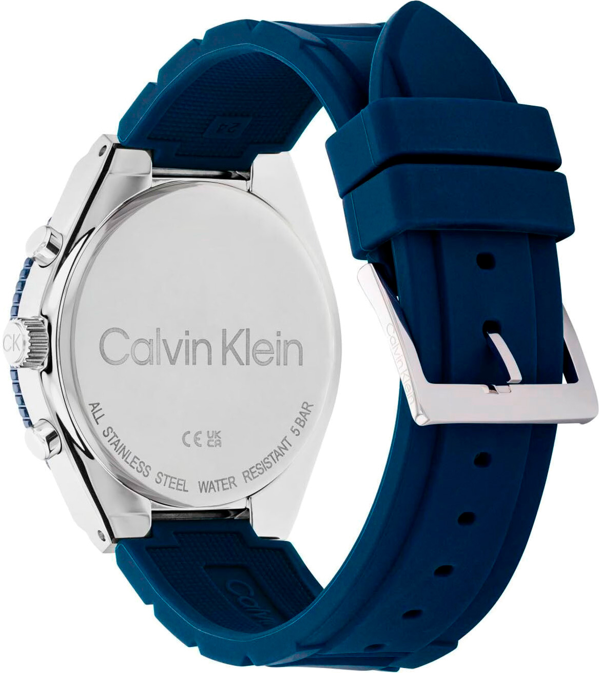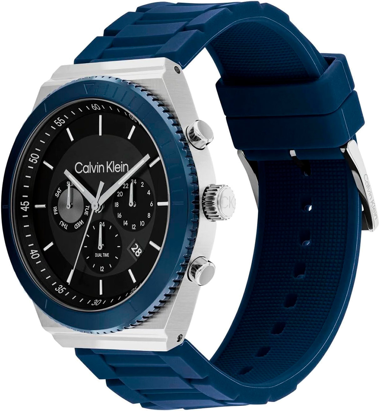 Функциональные часы с вторым часовым поясом - это идеальный спутник для тех, кто живет в ритме двух стран, объединяющий стиль и практичность в одном элегантном аксессуаре. Мужские кварцевые часы. Круглый стальной корпус с частичным синим IP покрытием. Рифленый безель. Сатинированный циферблат с фирменным логотипом Calvin Klein защищен минеральным стеклом. Метки в виде штрихов. По краю циферблата нанесена минутная шкала. Прямоугольные стрелки в стиле Baton с люминесцентным покрытием, которое светится в темноте после непродолжительной зарядки на свету. 12-ти и 24-х часовой формат времени. Второй часовой пояс в 24-х часовом формате времени отображается на отдельном циферблате. Окошко даты находится между часовыми отметками 4 и 5 часов. День недели вынесен на отдельный циферблат. Рифленая заводная головка украшена логотипом ''CK''. Удобный и прочный силиконовый ремешок с классической застежкой.