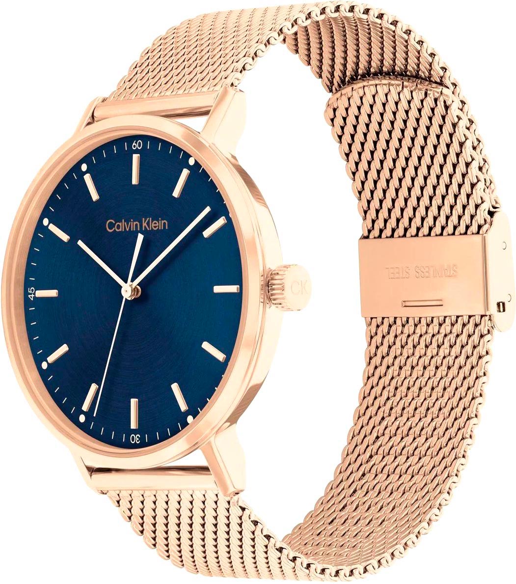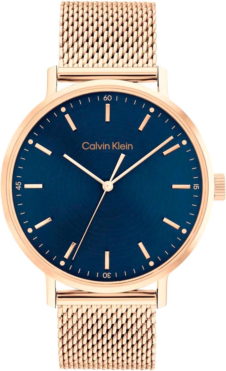 Глубокий синий цвет циферблата делает эти часы стильной деталью в вашем гардеробе. Мужские часы с круглым стальным корпусом Modern Mesh. Циферблат украшен фирменным логотипом Calvin Klein. Накладные метки в виде штрихов. Заводная головка украшена логотипом ''ck''. Браслет миланского плетения.