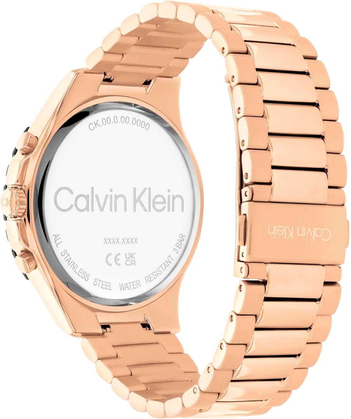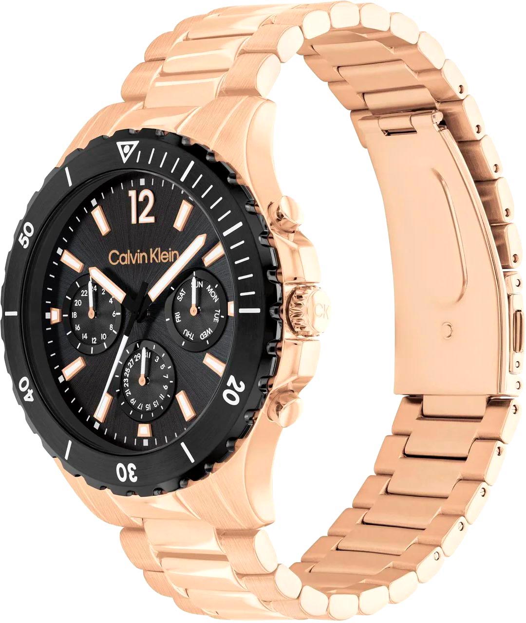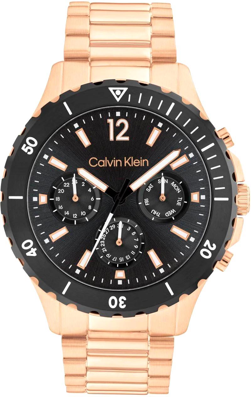 Стильные функциональные часы легко дополнит ваш повседневный образ с легким спортивным оттенком. Время для новых вариантов. Наручные кварцевые часы Sport For Him. Круглый стальной корпус. 12-ти и 24-х часовой формат времени. Циферблат выполнен по технологии Sunray (солнечные лучи) и украшен фирменным логотипом Calvin Klein. Дата и день недели вынесены на отдельные циферблаты. Накладные метки в виде штрихов и арабской цифры ''12''. Заводная головка с защитой украшена логотипом ''ck''. Стальной браслет с раскладывающейся застежкой.