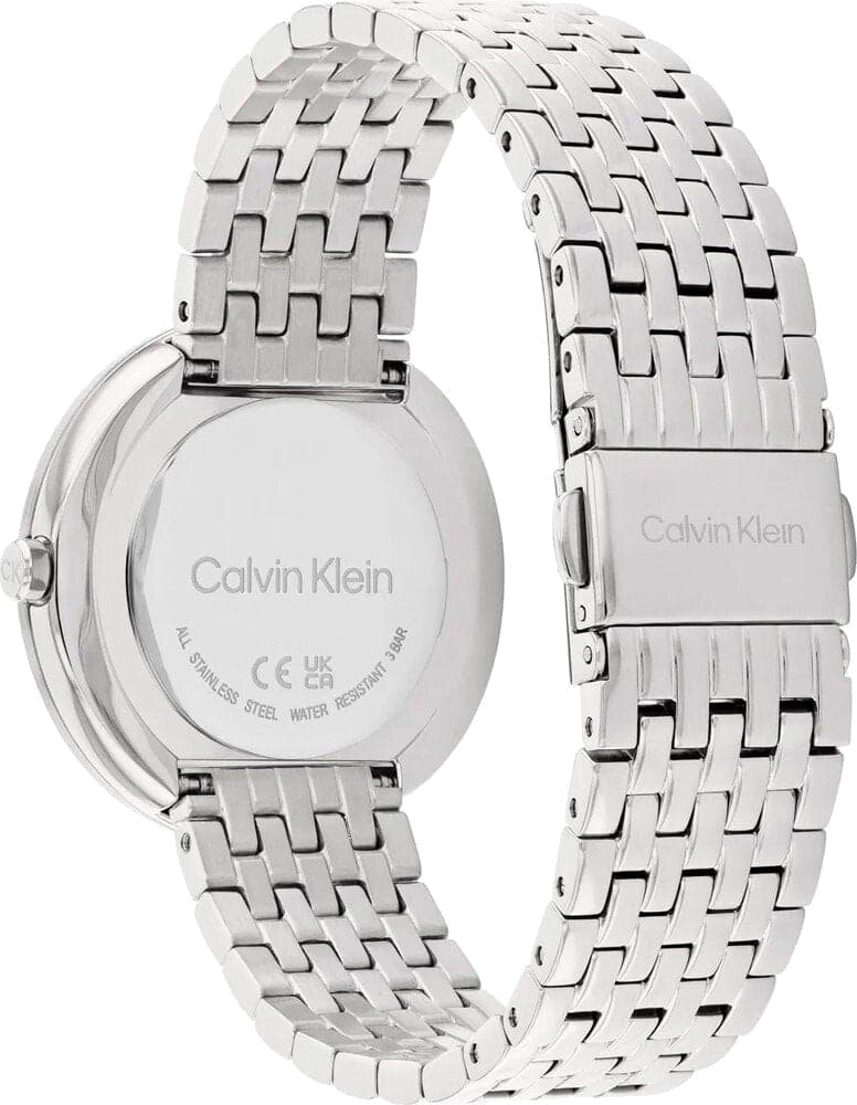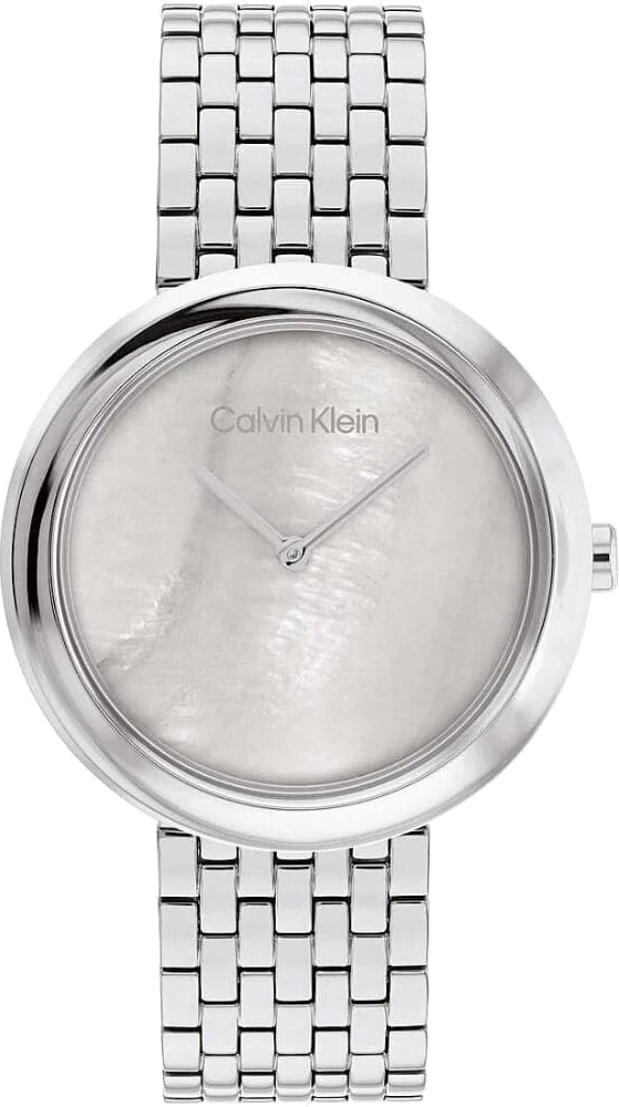 Изысканные часы, которые подчеркивают индивидуальность и стиль своей обладательницы, придавая ее образу утонченность и завершенность. Женские кварцевые часы. Полированный корпус круглой формы из нержавеющей стали. Закрученный безель. Перламутровый циферблат без меток украшен фирменным логотипом Calvin Klein и защищен минеральным стеклом. Прямоугольные стрелки в стиле Baton. Секундная стрелка отсутствует. Заводная головка украшена логотипом ''CK''. Надежный стальной браслет с раскладывающейся застежкой с двумя кнопками и логотипом бренда Calvin Klein.