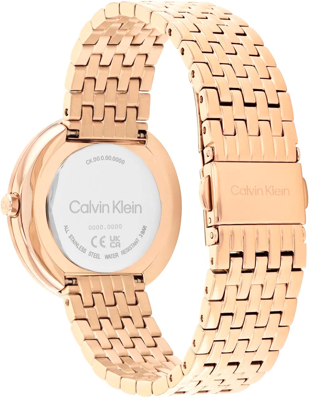 Перламутровый циферблат без меток украшен фирменным логотипом Calvin Klein. Прямоугольные стрелки в стиле Baton. Секундная стрелка отсутствует.