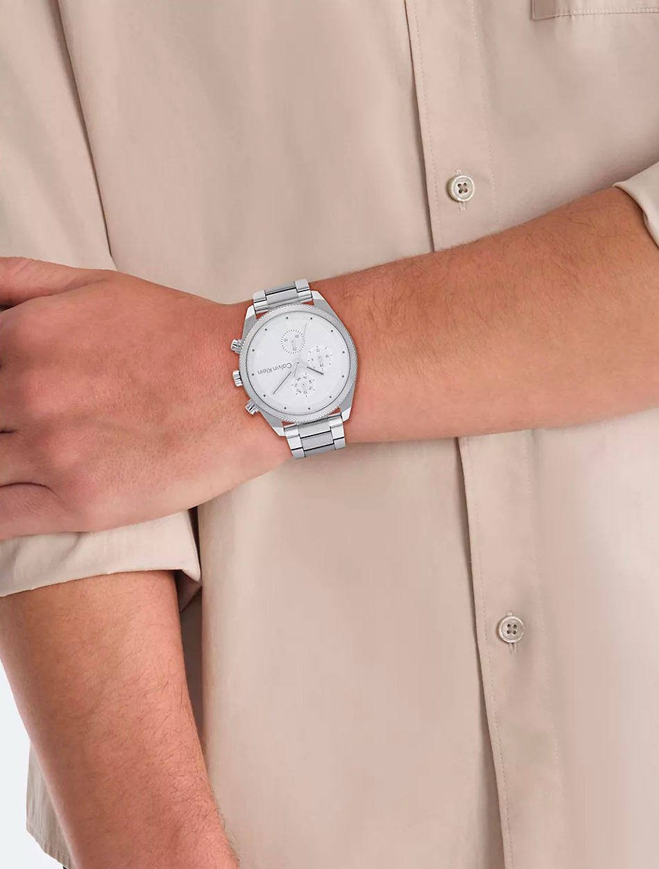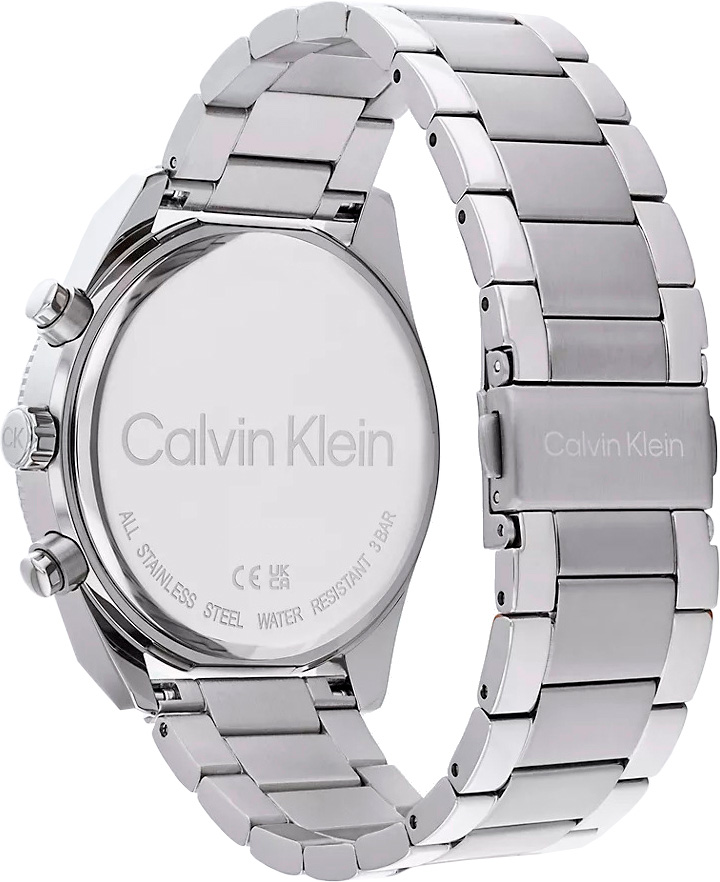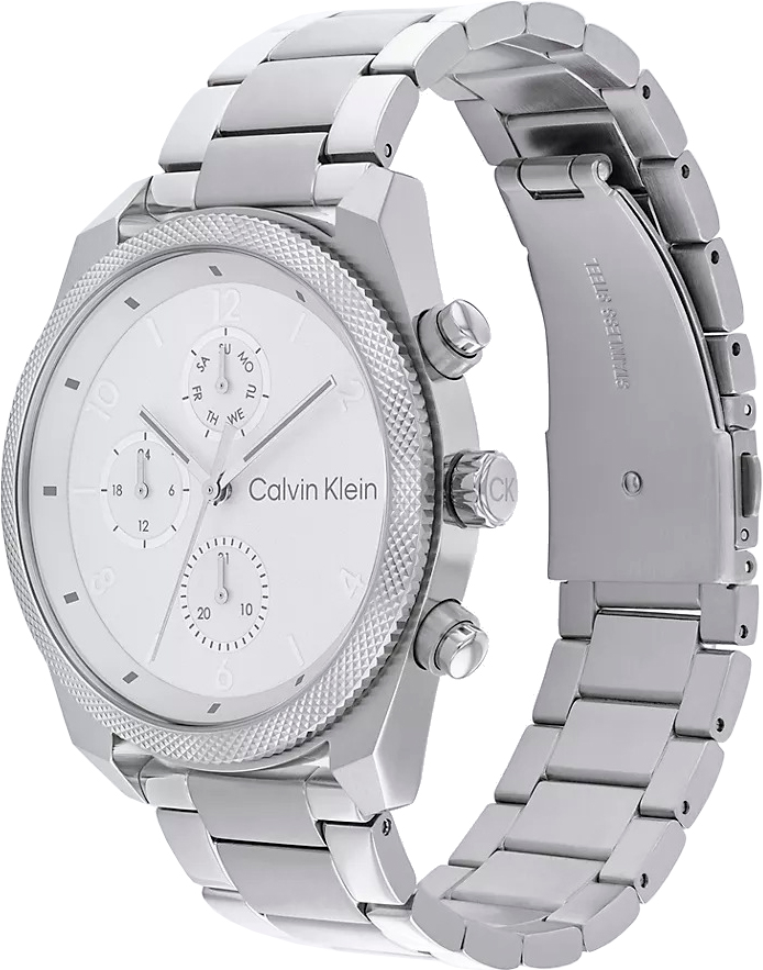 Элегантные и стильные часы идеально сочетают в себе утонченный дизайн и высокую функциональность, которые подчеркивают безупречный вкус и статус их владельца. Мужские кварцевые часы. Корпус круглой формы из нержавеющей стали. Рифленый безель с узором. Циферблат украшен фирменным логотипом Calvin Klein в положении 3 часа и защищен минеральным стеклом. Метки в виде арабских цифр и штрихов. Прямоугольные стрелки в стиле Baton. Дата, день недели вынесены на отдельные циферблаты. 12-ти и 24-х часовой формат времени. Заводная головка украшена логотипом ''CK''. Надежный стальной браслет с раскладывающейся застежкой с двумя кнопками и логотипом бренда Calvin Klein.