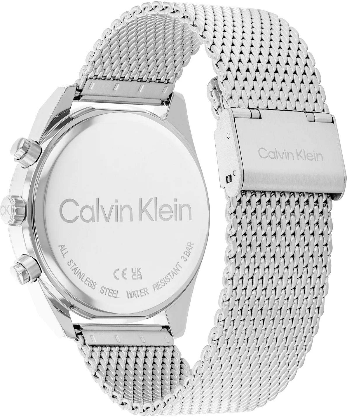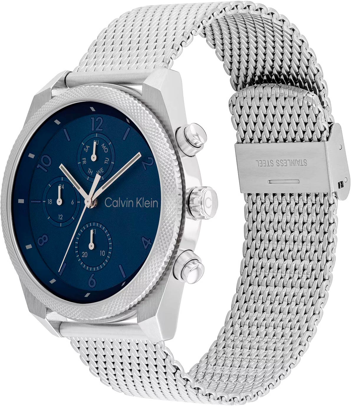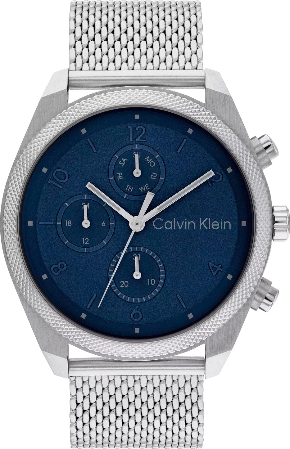 Элегантные и стильные часы идеально сочетают в себе утонченный дизайн и высокую функциональность, которые подчеркивают безупречный вкус и статус их владельца. Мужские кварцевые часы. Корпус круглой формы из нержавеющей стали. Рифленый безель с узором. Циферблат украшен фирменным логотипом Calvin Klein в положении 3 часа и защищен минеральным стеклом. Метки в виде арабских цифр и штрихов. Прямоугольные стрелки в стиле Baton. Дата, день недели вынесены на отдельные циферблаты. 12-ти и 24-х часовой формат времени. Заводная головка украшена логотипом ''CK''. Стальной браслет миланского плетения. Застежка с логотипом бренда Calvin Klein.