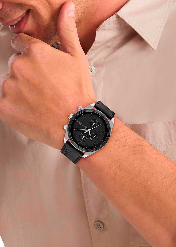 Зернистый матовый циферблат украшен фирменным логотипом Calvin Klein в положении 3 часа и защищен минеральным стеклом. Накладные метки в виде арабских цифр и штрихов.
