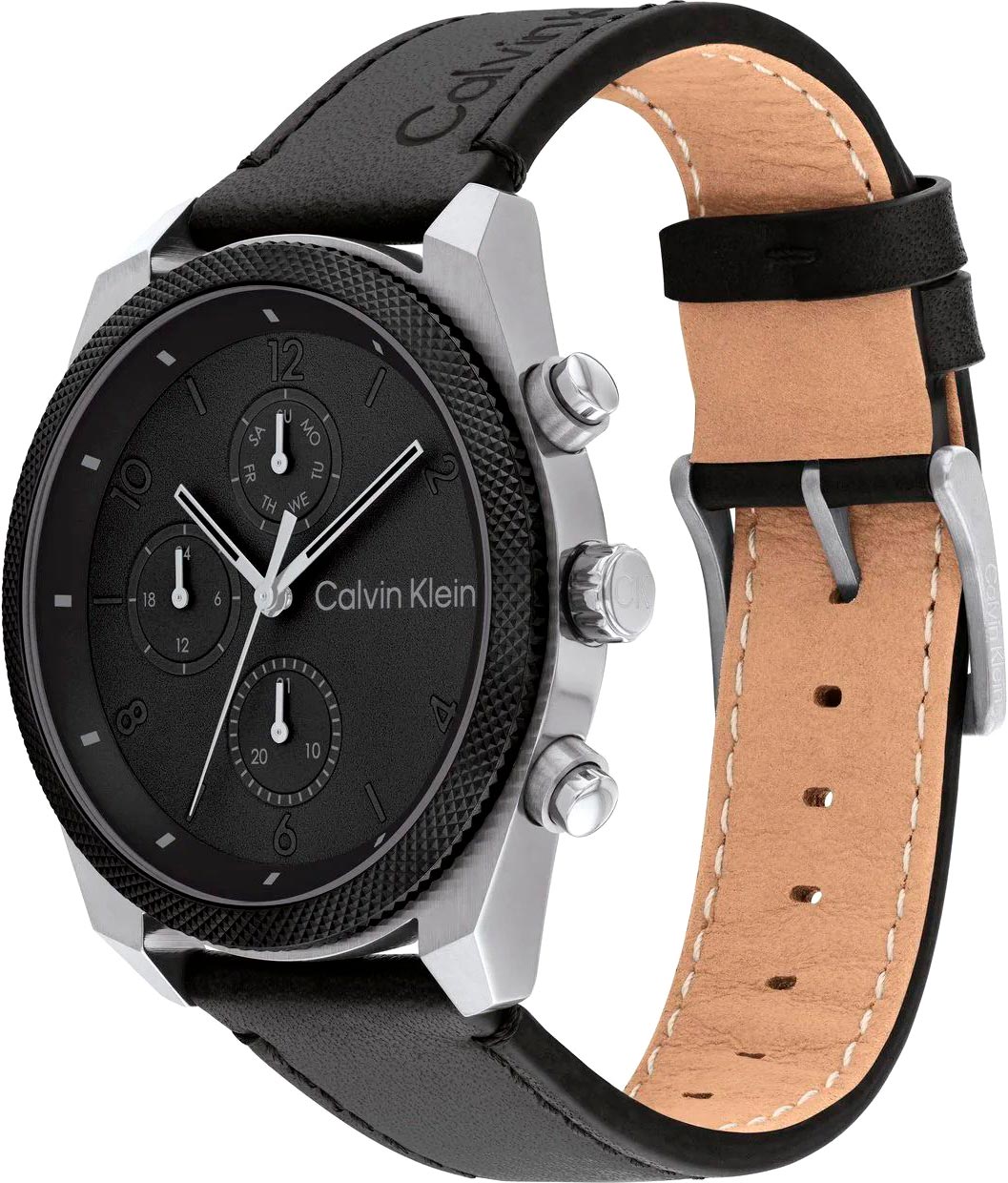 Дата и день недели вынесены на отдельные циферблаты. 12-ти и 24-х часовой формат времени. Рифленая заводная головка украшена логотипом ''CK''.