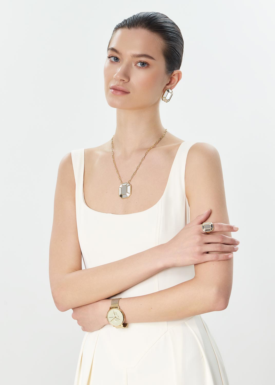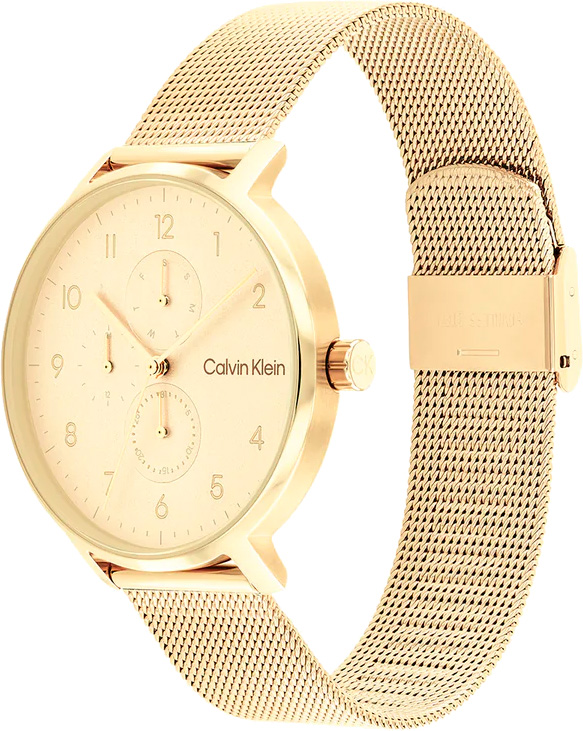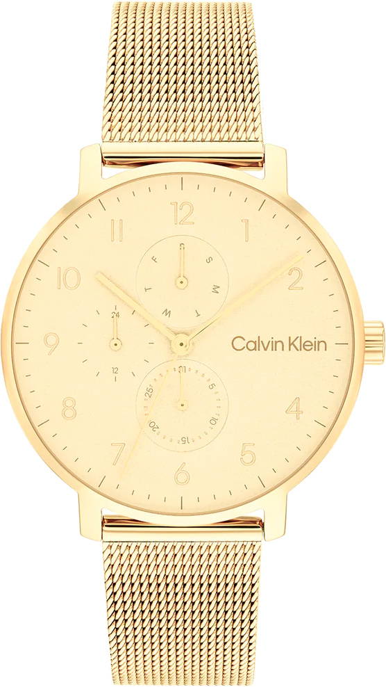 Дизайнерские функциональные часы - изюминка часового искусства, сочетающая в себе точность, надежность и стиль для самых требовательных ценителей времени. Кварцевые часы унисекс. Полированный корпус круглой формы из нержавеющей стали с IP покрытием цвета желтого золота. Циферблат украшен фирменным логотипом Calvin Klein в положении 3 часа и защищен минеральным стеклом. Метки в виде арабских цифр. Прямоугольные стрелки в стиле Baton. Дата, день недели вынесены на отдельные циферблаты. 12-ти и 24-х часовой формат времени. Рифленая заводная головка украшена логотипом ''CK''. Стальной браслет миланского плетения с IP покрытием цвета желтого золота. Застежка с логотипом бренда Calvin Klein.